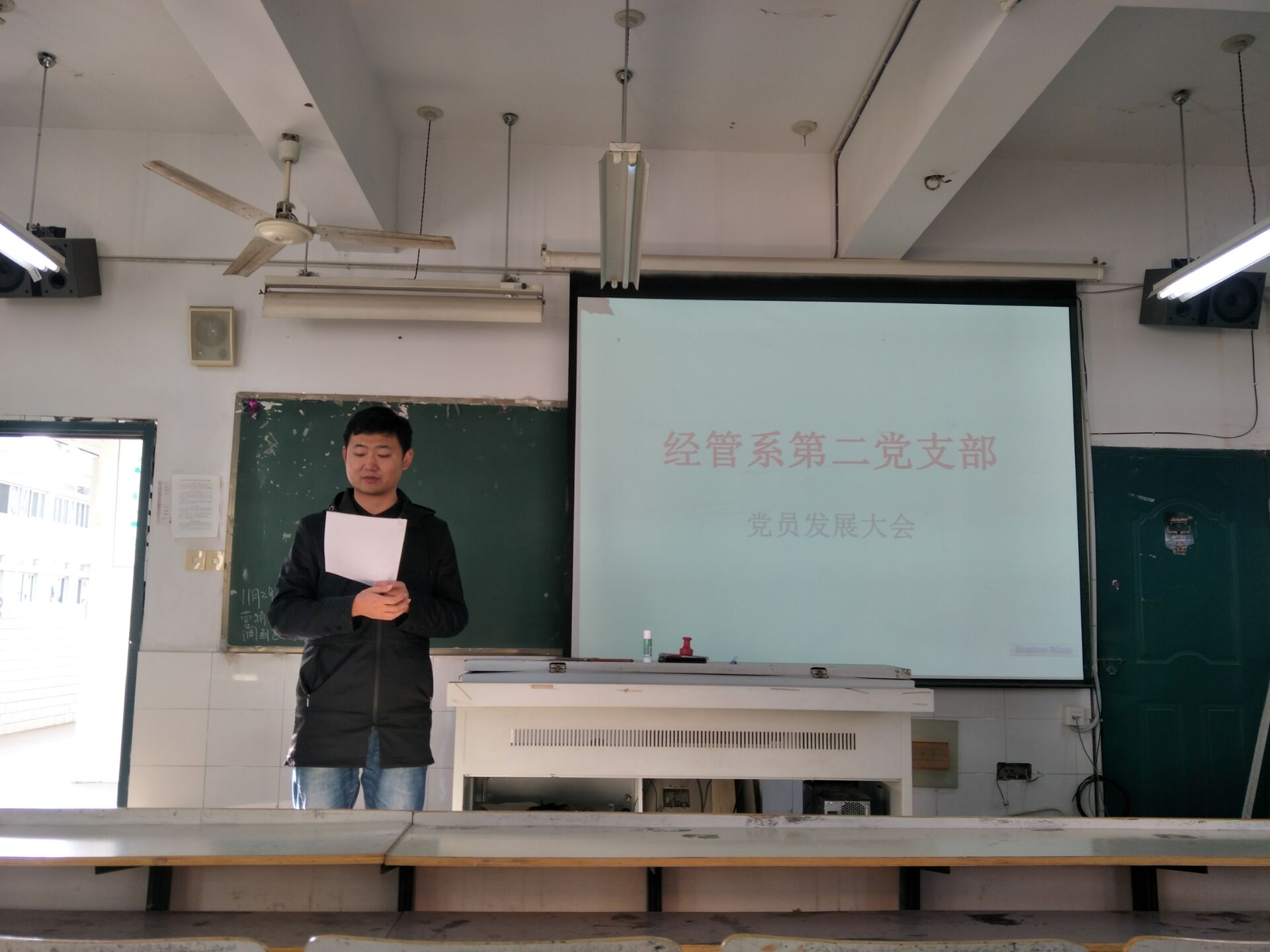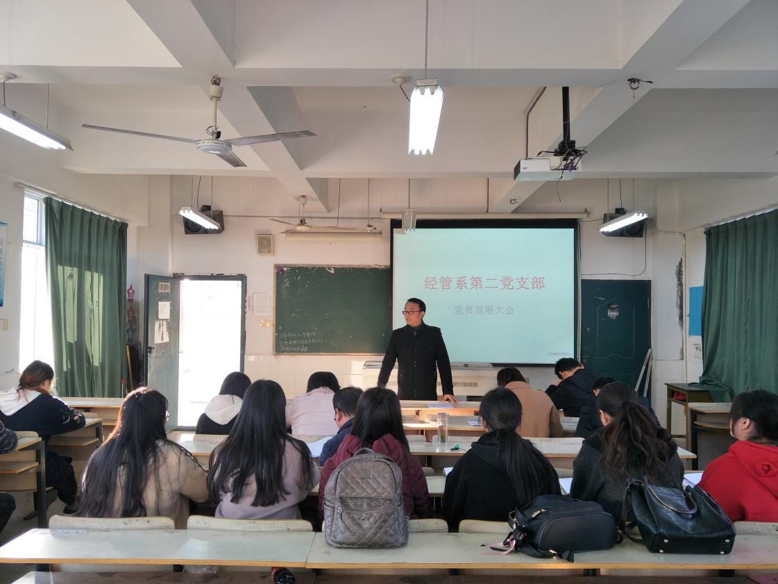 本网讯 为壮大党员队伍,吸收更多优秀同志加入党组织。11月29日,经济与社会管理系(思政部)第二支部于E401教室召开了支部党员发展大会,系主任、党总支副书记甘志华,团总支书记欧阳文清,第二党支部书记杨健,党支部全体党员、党员发展对象参加本次会议。