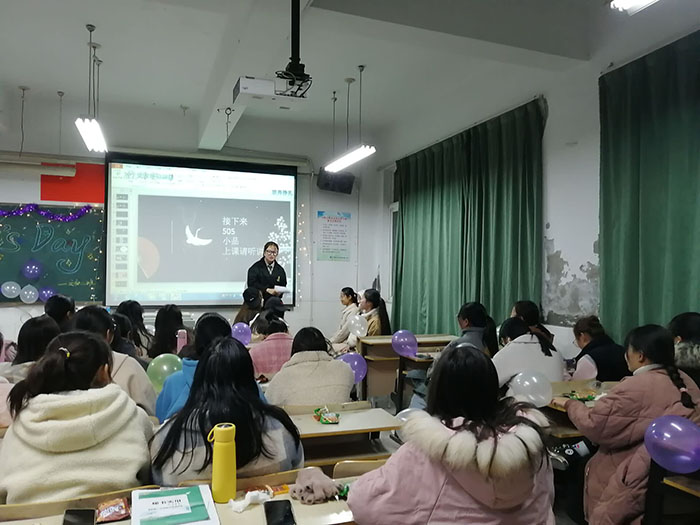 每个班级的固定教室都用彩带、气球、彩灯等进行了精心布置,准备了各种美味的小零食。走进2019级新闻采编与制作(3)班,吴俊、聂敬雯正在为同学们表演街舞,动感的音乐,有力的舞姿展现出青春的活力,将现场气氛推向高潮,她们完美的表演赢得了全班同学的阵阵掌声。随后,同学们一起合唱歌曲《起风了》,“岁月不同侧脸,猝不及防闯入你的笑颜……”同学们尽展风采,表达着自己对这个大家庭的喜爱。闪烁的灯光,专业的音响设备也为表演增添了色彩。