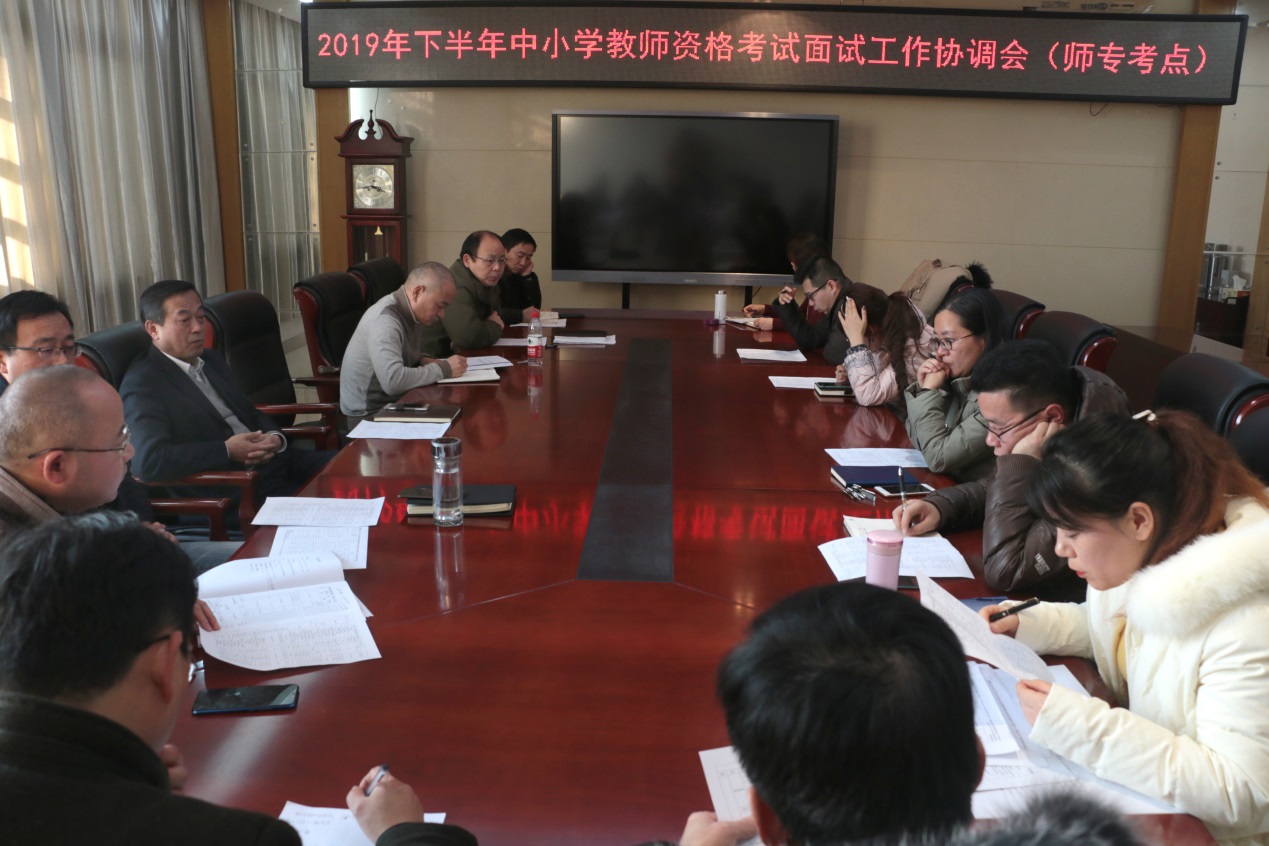 教师教育系(基础部)主任秦东方主持会议,相关部门负责人参与会议。教师教育系技能部主任王岚简要介绍2019年下半年教师资格证面试工作整体情况,各部门负责人汇报了工作进程,积极建言献策。