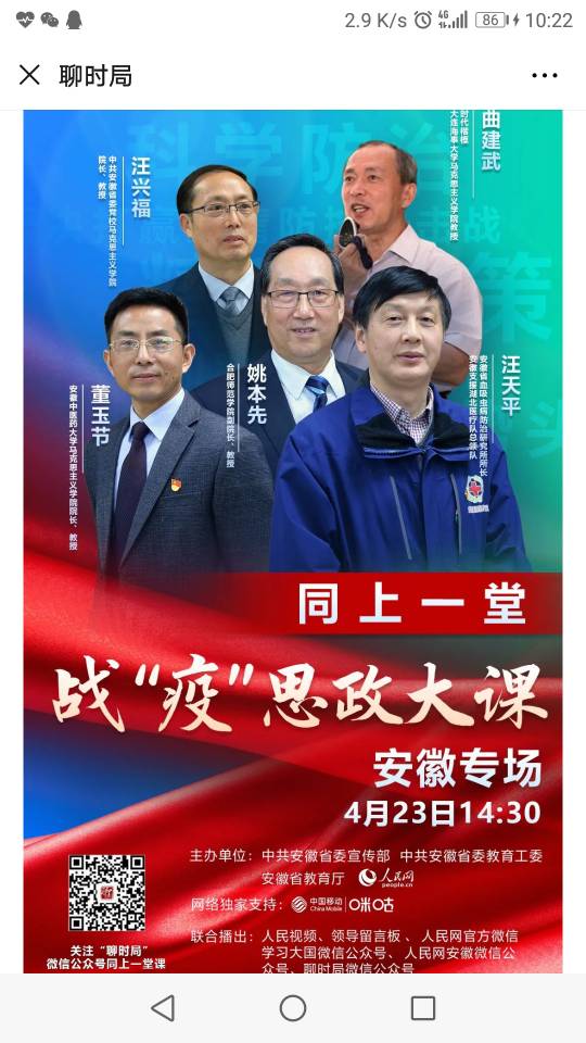 本网讯 为进一步坚定战胜疫情的信心,增强听党话、跟党走的情感认同,引导广大学生树立正确的世界观、人生观、价值观。中共安徽省委宣传部、中共安徽省委教育工委、安徽省教育厅与人民网决定,于2020年4月23日下午14:30,联合组织“同上一堂战‘疫’思政大课”。食品工程系全体同学积极参。