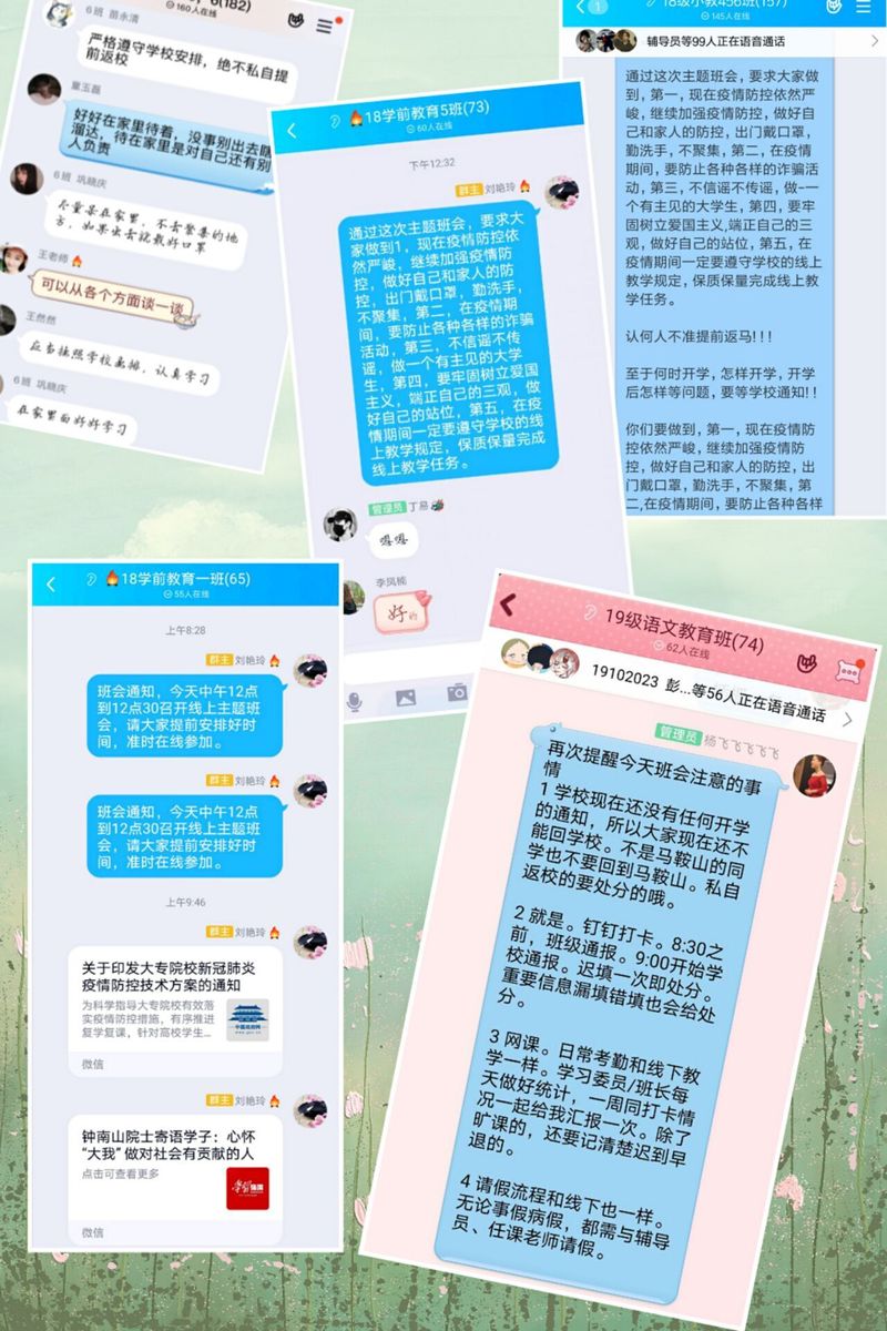2018级小学教育4、5、6班辅导员陈龙妹则在班会第一个环节中将自己在一些重要平台上看到的多篇关于疫情期间安全教育的文章发给了同学们,让同学们了解了近期所发生的关于疫情防控方面的重要信息。接着,陈老师强调了疫情期间的安全教育,特别是防各类诈骗。她还向同学们进行了爱国主义和理想信念教育,告诉大家特殊时期要认真对待线上学习,认真阅读关于疫情防控的文章。在第二个环节中,同学们积极讨论在疫情期间如何防控,分享学习、生活,同时倾诉疫情期间所遇到的困难,期望用集体的智慧帮助解决。