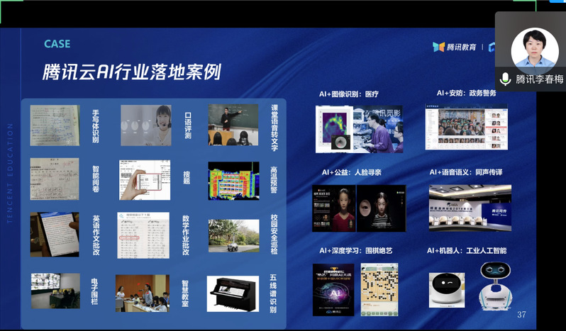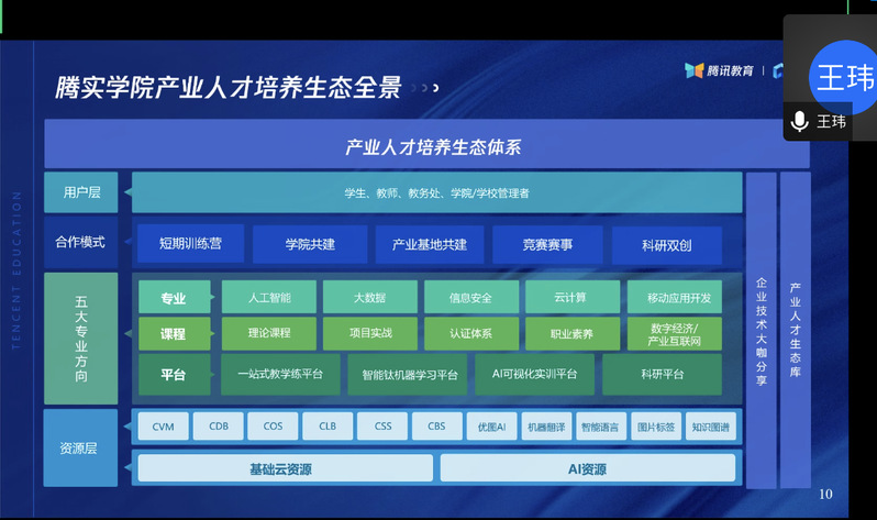 随后,李总介绍了腾讯云人工智能(AI)行业落地案例、腾讯云AI产业全景和人工智能专业在专科层次的课程培养目标。着重介绍了滕实学院AI人才培养中的人才培养目标、教学资源建设、实训室建设-教学与实训平台、实训室建设-实训资源建设、实训室建设-实训区域规划、大师工作室、师资培训、认证与实习就业以及相关的合作案例。