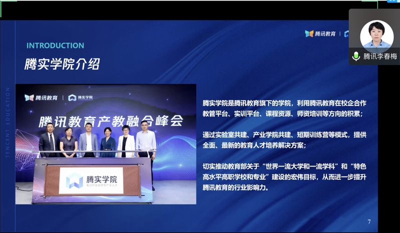 首先,腾讯云计算有限责任公司的李总介绍了腾讯公司的概括、腾讯云与智慧产业布局,强调了目前腾讯云的主要应用在教育、医疗、旅游三大产业。在腾讯与教育产业合作的介绍中,阐述了高校与腾讯教育团队暨腾实学院的合作方式,并说明了腾实学院目前的产业人才培养生态体系和相关的5个合作模式以及部分合作案例。