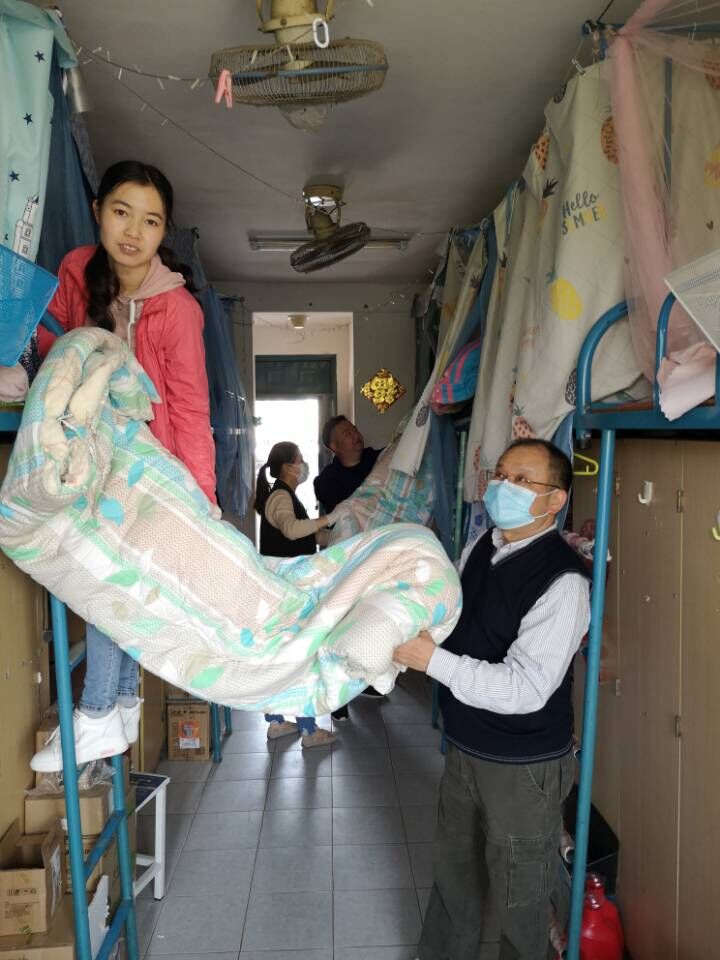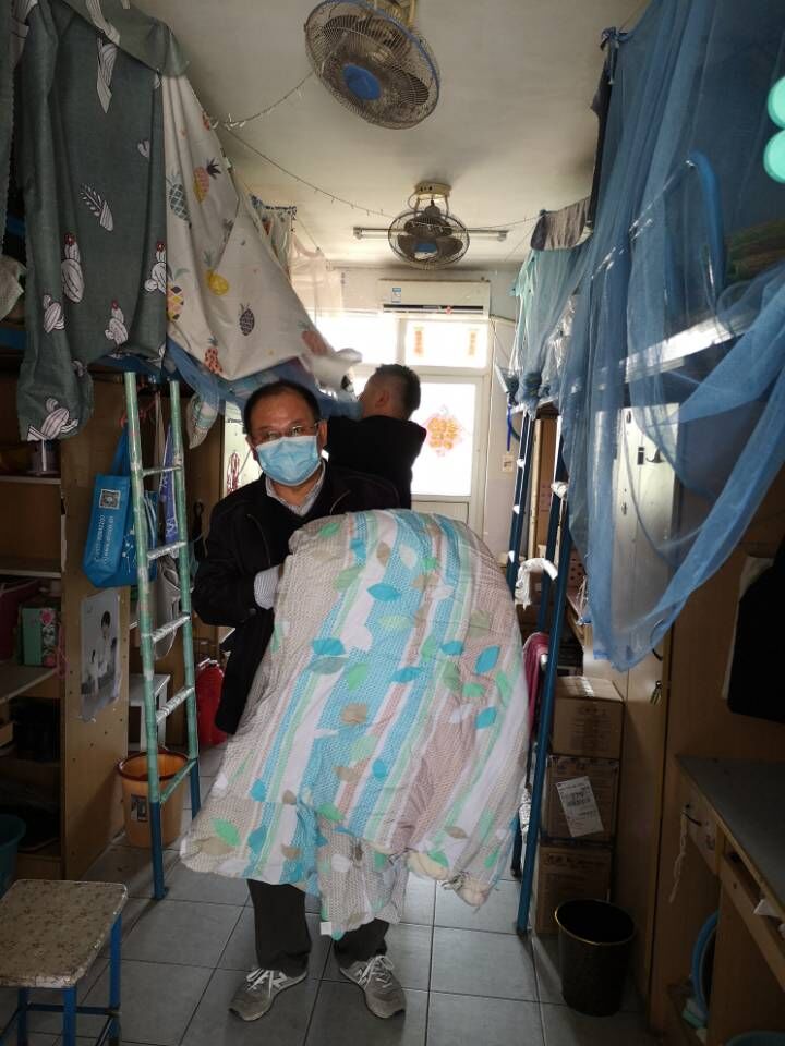 经过半个上午和半个下午的晾晒,辅导员还要拍灰尘,将被子收回后再折叠,然后送回相应宿舍的相应床位。