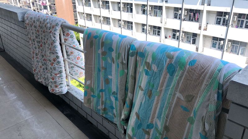 孙兴敏老师介绍,目前执行晒被子的方式为预约式,学生们通过网络或电话,向辅导员发出申请,将自己和床位的详细信息留下。接到预约后,辅导员会根据天气情况,分批晾晒。在此期间,辅导员会对每一床被子进行标注,确保不张冠李戴。