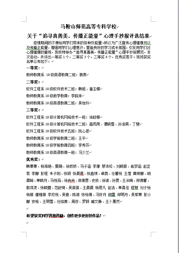 本次手抄报比赛,丰富了返校学生的学习兴趣及创新能力,激发了学生乐观积极向上的生活态度和对真善美的追求和向往。在同学们为班级荣誉而战的同时也无形中提高了班级凝聚力,对创建和谐美好的校园贡献了一份力量。(文图/贾顺雨 袁焱 审核/李娉婷)