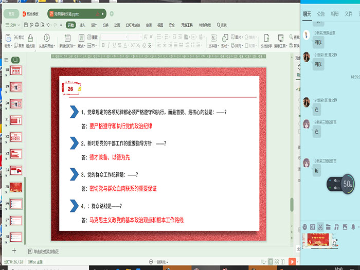为巩固入党积极分子章程学习的效果,活动还安排了知识竞答环节。“党的群众纪律是什么?”黄安格抛出了第一个问题,该系部2019级新闻采编与制作(3)班的纪苗苗踊跃回答道:“是密切党和群众血肉联系的重要保证。”紧接着,黄安格提出下一个问题:“党的性质是什么?”该系部2019级新闻采编与制作(2)班的阚朝阳抢答道:“中国共产党是中国工人阶级的先锋队,同时是中国人民和中华民族的先锋队,是中国特色社会主义事业的领导核心,代表中国先进生产力的发展要求,代表中国先进的前进方向,代表中国最广大人民的根本利益。”同学们积极的态度,准确的回答得到了其他入党积极分子的认可和称赞。