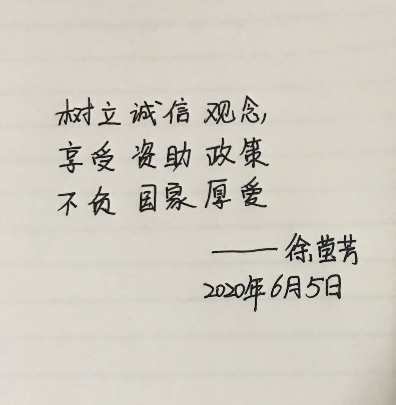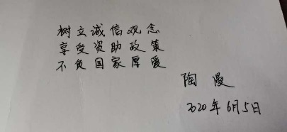本网讯 诚信,乃为人之本,人无信则不立。诚信是中华民族传统文化的精髓,是社会正在倡导的道德风尚。为了提高大学生诚信意识,促进助学贷款健康发展,食品工程系于2020年6月组织19级食品检测技术班同学通过手写并拍照的形式开展了诚信资助签名活动。