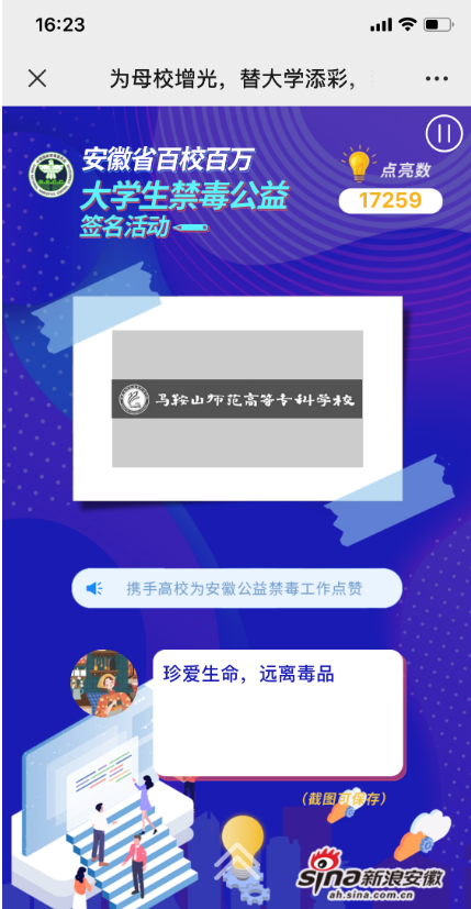 食品工程系学生积极报名参与了此次活动。活动开始后,同学们进入微博活动专区,对于“禁毒知识”话题进行讨论,并在在弹窗内选择所在院校及禁毒宣传标语后,设计个性禁毒签名展示,点亮校园禁毒公益头像,展现了我系学子能够做好禁毒斗争的信心。