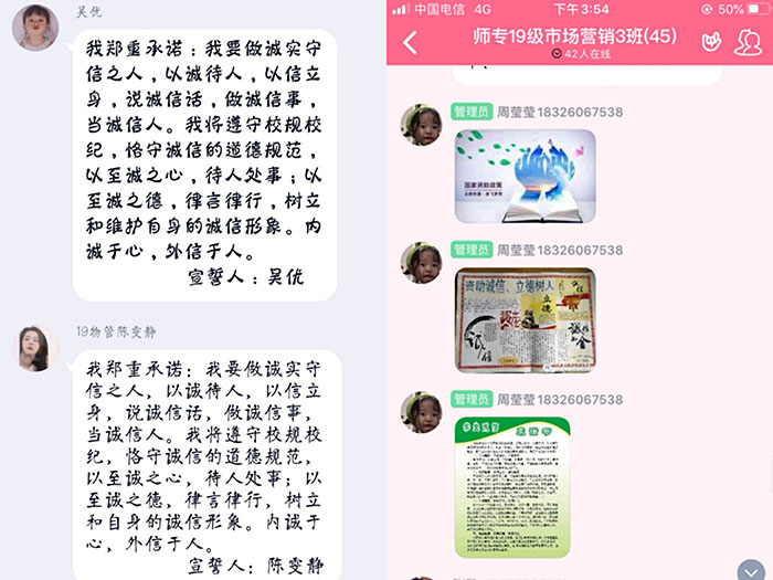 6月15日,为了使受资助学生树立良好诚信意识,各班级开展了诚信图片展示活动和线上诚信宣誓活动。受资助的学生们表示,会严以律己,用诚信约束自身行为,以誓言中的“砥砺诚信品格,塑造诚信人生”为奋斗目标,努力做好身边的每一件事。