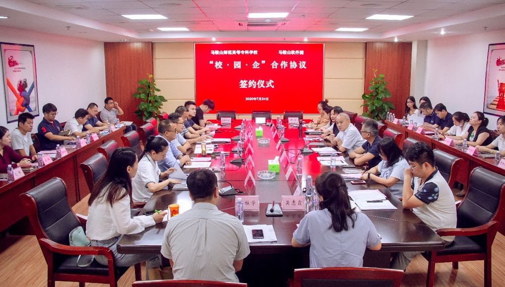 本网讯 7月24日,马鞍山师范高等专科学校——马鞍山软件园“校·园·企”合作签约仪式暨软件与互联网学院第三届理事会第一次会议在马鞍山软件园第一会议室隆重举行。马鞍山师专党委委员、副校长张勇军,马鞍山软件园党工委书记、管委会主任赵建鸣,管委会副主任姚正,马鞍山百助网络科技有限公司副总经理周慧,学校软件工程系副主任鲁兵等参加会议。会议由软件工程系党总支书记王莉娟主持。
