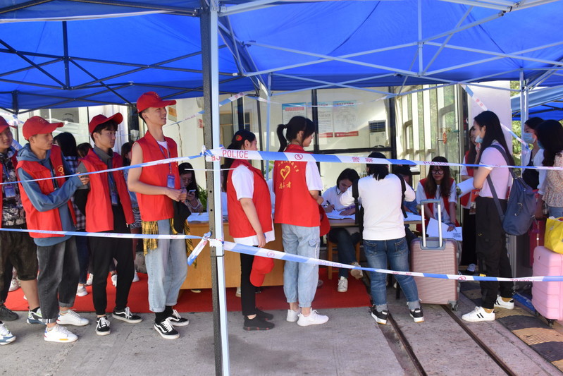 上午七点半点开始,新生接踵而至,报到点排起了长长的队伍。因为疫情防控的需要,今年家长不能陪同新生入校,所以志愿者承担了大部分的行李搬运工作。志愿者们不辞辛苦,尽管已经大汗淋离,仍然洋溢着微笑,热情地接过新生手中沉重的行李,介绍校园生活、校园环境,引导新生进入学生宿舍。
