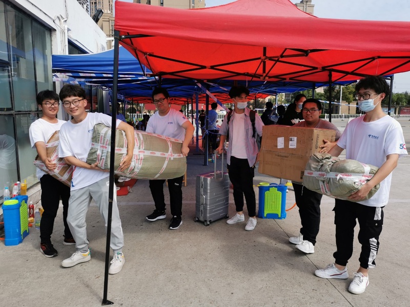 为方便新生搬运行李,学校安排多辆观览车点对点送到新生所在公寓楼,帮助新生搬运行李,并派志愿者将学生们的大件行李搬送至寝室,学校公寓楼也安排了专门的志愿者老师量体温,宿舍登记,让新生更加快速地融入我们的大家庭。