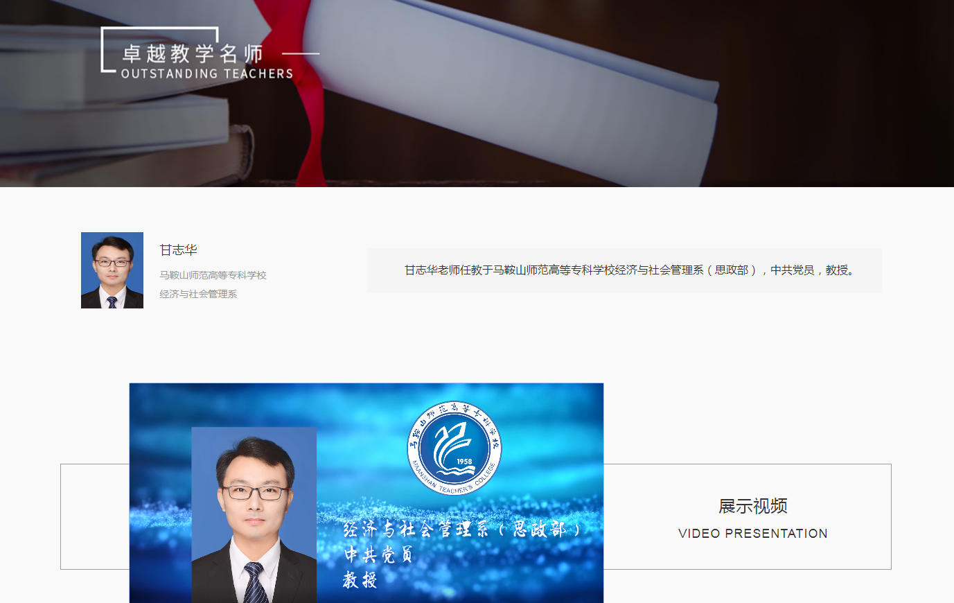 本网讯 春华秋实,桃李沁香。马鞍山师范高等专科学校经济与社会管理系(思政部)教授甘志华老师于今年9月入围“安徽省高校百位卓越教学名师风采展示活动”。甘志华老师的学者之风令人敬佩,在全体教职工心中树立了优秀的学习榜样。
