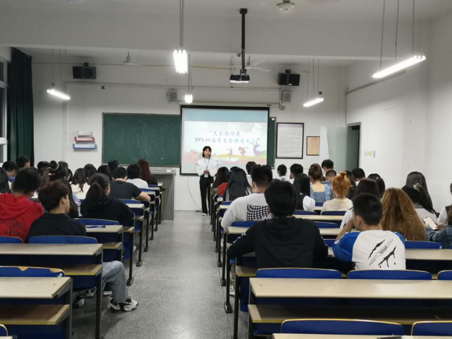 本网讯 9月18日晚上18:30,艺术设计系于丹青楼303举办了第十四届学生会换届会议。出席人员有系学生会指导老师王昀,18级学生会主席王根龙、刘灿洁,以及18级学生会全体部长。