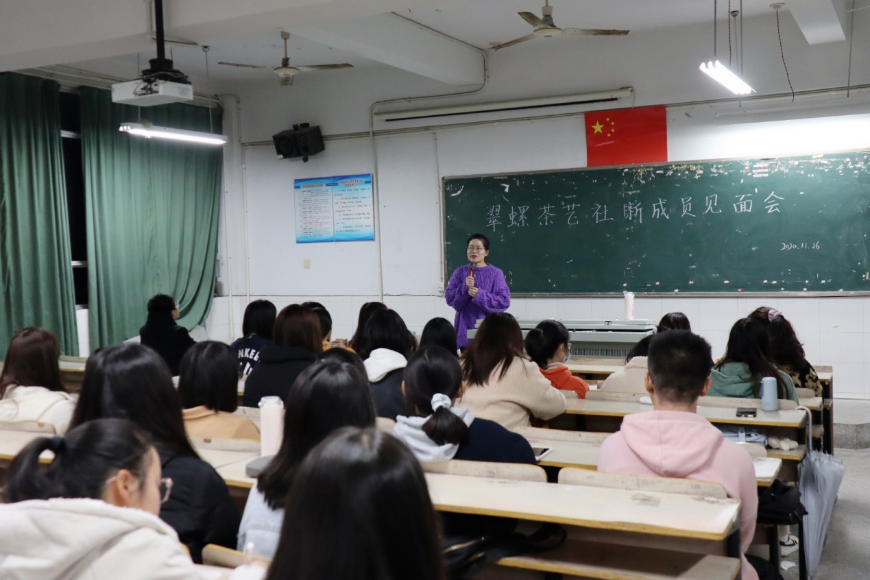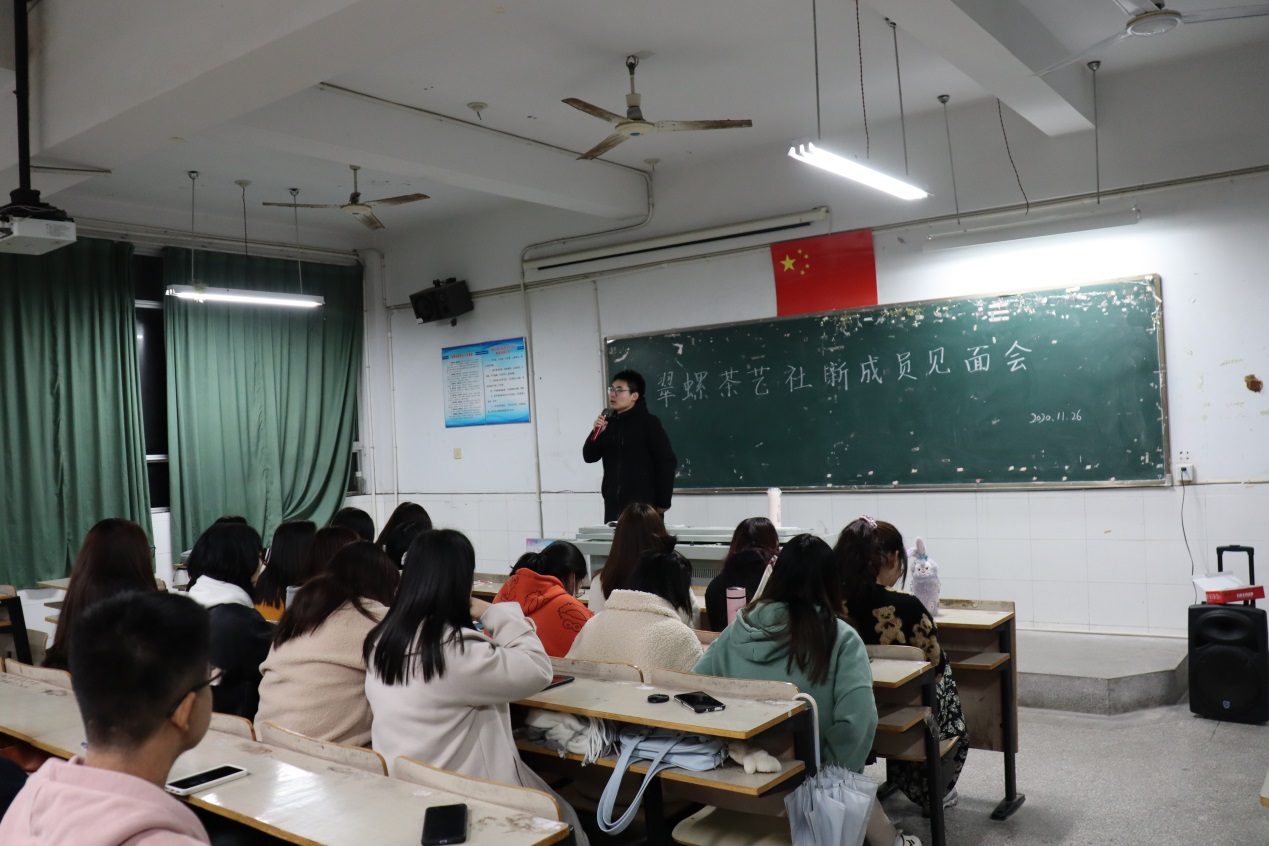 本网讯 为进一步拉近社团新老成员的距离,传达社团发展宗旨,11月26日晚翠螺茶艺社在博学楼206教室成功召开了社团新老成员见面会。此次会议由该社副社长陈琛主持,指导教师曹本霞、前社长韩少权、社长胡子浩参加会议并发言。