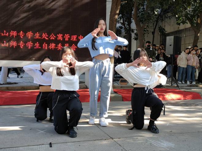 开幕式上的文艺表演,节目种类丰富多样,从舞蹈、歌曲到吉他、朗诵,中间还穿插着与各位同学互动的游戏,节目样式丰富多彩。从开场舞蹈《baby》到鼓励同学们不懈追求梦想的《追光者》,男团舞蹈《EIEI》还未出场,台下就已经欢呼声一片,在梦已准备就绪、未来可期的男团舞蹈《EIEI》后,同学们听到了歌曲对唱《说散就散》,从热情似火的女团舞蹈《how you like that》到处于青春的迷茫、让人追忆逝去的年华的《老男孩》。最后,活动伴随着曾令无数年轻人向往和憧憬伟大爱情的诗歌朗诵《致橡树》中结束。