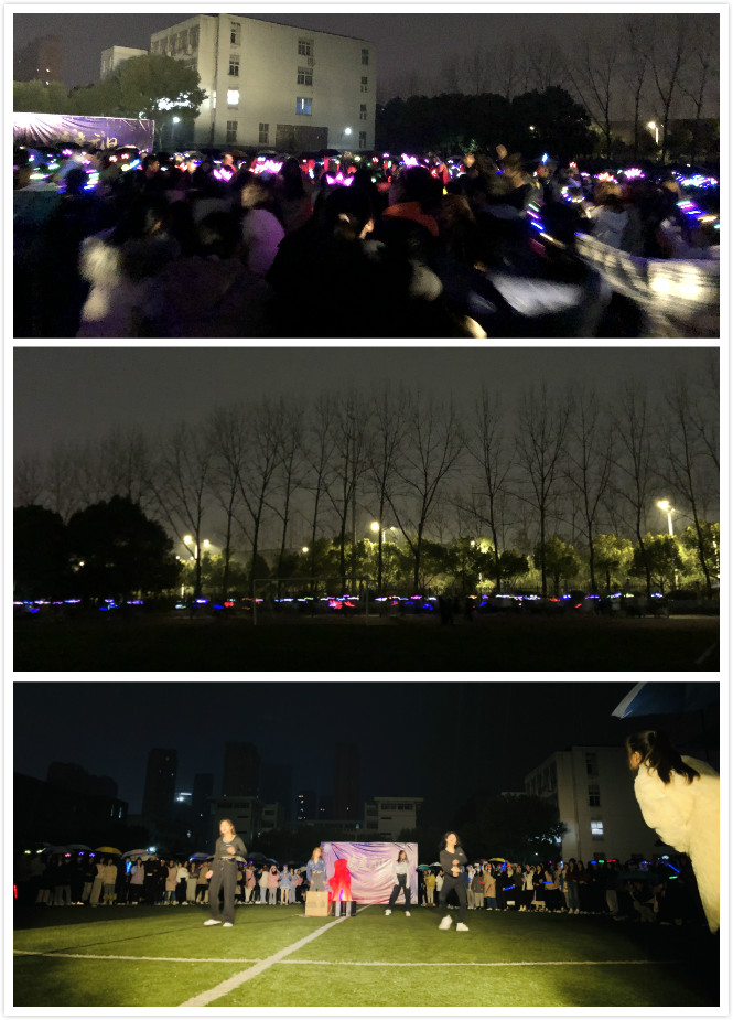 此次篝火晚会由吴俊主持。在绵绵的细雨中,同学们伴随着火焰的渐渐燃起,手拿荧光棒,头戴荧光皇冠,在操场中心围成一个圆圈,为演员们搭起了一个临时舞台。开场艺舞社用热情的舞蹈点燃了现场气氛,同学们也伴随着音乐律动着。舞蹈结束后,掌声和喝彩声不断。紧接着大学生艺团为大家带来了男女对唱《我要你》,随后,学生社团同济协会与话剧社共同表演了《歌曲串烧》。晚会活动内容丰富多彩,形式异彩纷呈,在场的同学们参与感极强。最后,大家手牵手,心连心,现场气氛达到顶峰,音乐停下后现场的同学们仍意犹未尽,紧接着开始了晚会的重头戏——荧光公益夜跑。同学们纷纷点亮了自己的荧光头饰,一瞬间,操场仿佛星空般闪耀,大家跟随着主持人的节奏,大声地倒数着“5——4——3——2——1”,无关里程,无关终点,音乐不停,夜跑不止。晚会伴随着大家的脚步,圆满的落下帷幕。