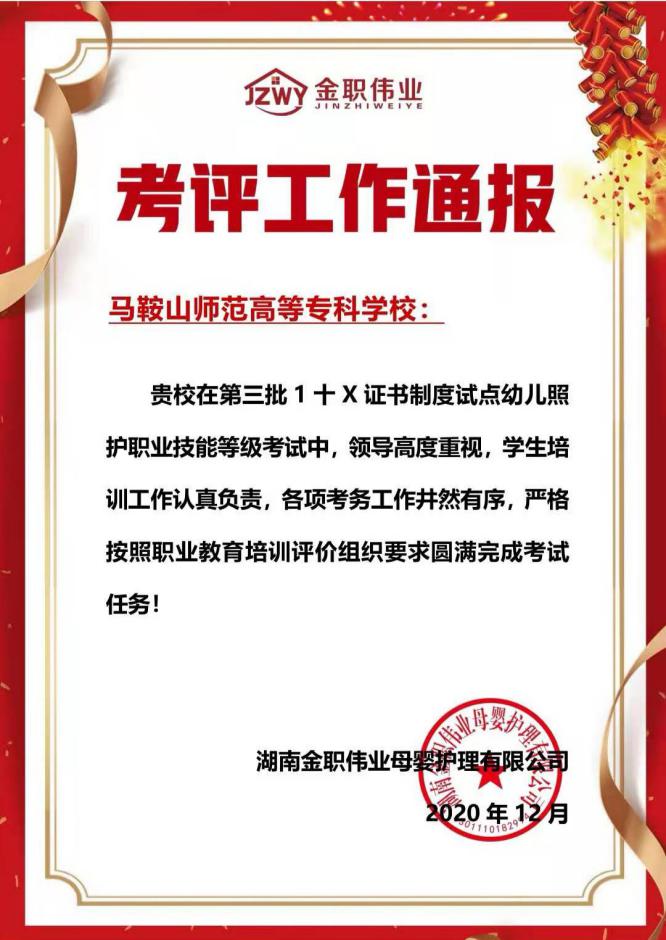 本网讯 为积极响应教育部《关于在院校实施“学历证书+若干职业技术技能等级证书”制度试点方案》文件精神,推进1+X幼儿照护试点与母婴护理试点项目的实施,实现训育结合,推动三教改革,2020年12月26-27日,马鞍山师专学前教育专业启动1+X幼儿照护与母婴护理职业技能等级证书首轮考核,150名在校生参与了该项考核。