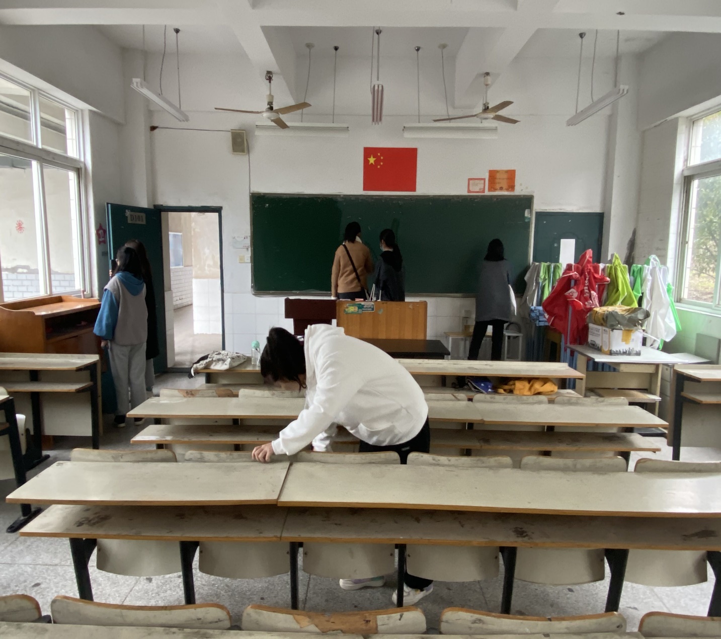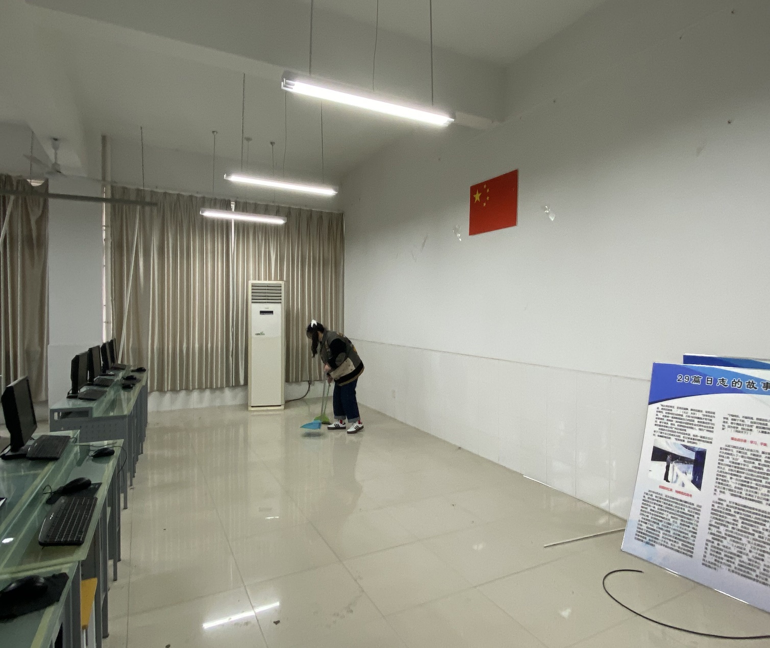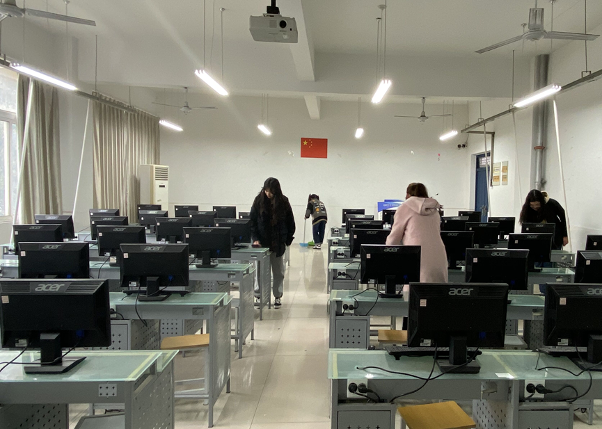 中午12时,三十余名学生会成员准时在精业楼前集合。学生会主席李彩雷将他们分为两支队伍,第一分队由办公室、安全部和心理部组成,负责打扫教师办公室;第二分队由学习部、生活部和文体部组成,负责实训楼机房的清洁工作。