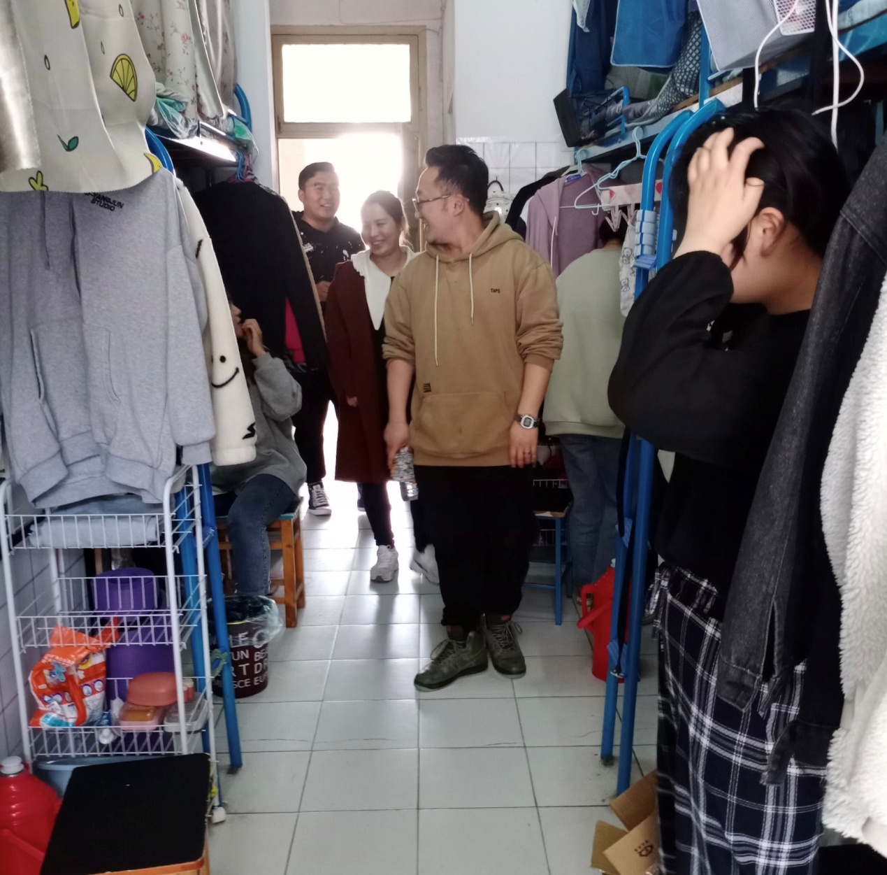 活动中,首先是陈小凤一行集中抽查了部分问题宿舍,对日常检查中发现的问题进行了回访和督查,一是督促学生做好卫生整改,二是有针对性地就个别宿舍使用违规电器和晚归情况进行核实与批评教育。随后,各辅导员分别走访了自己所带班级宿舍,对该系部全体在校生宿舍进行了摸排检查。走访中,辅导员们除了检查宿舍卫生和大功率电器使用情况外,还不时地叮嘱同学们要经常开门、开窗通风,做好春季传染病预防和疫情防控工作,有问题及时向辅导员反馈。