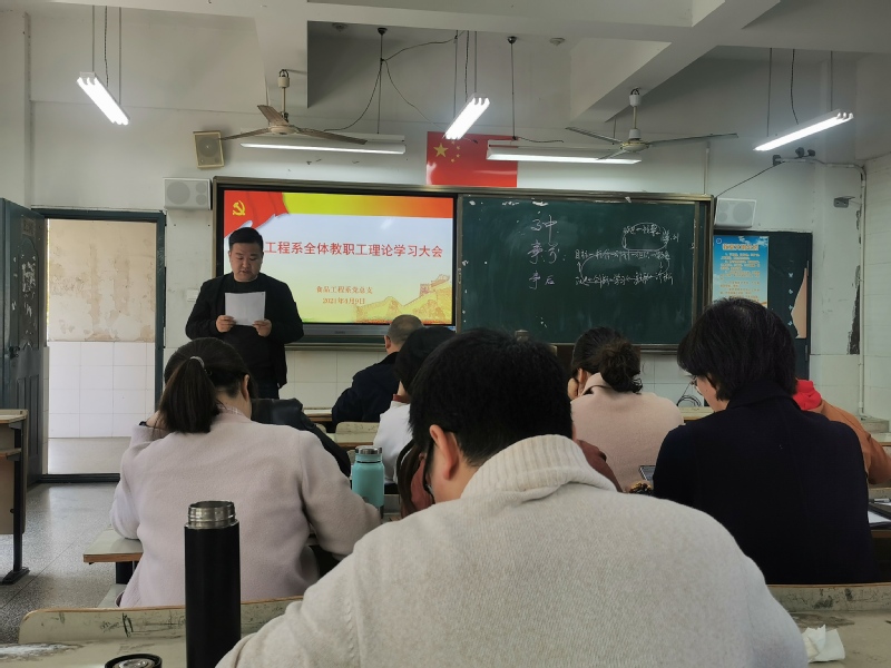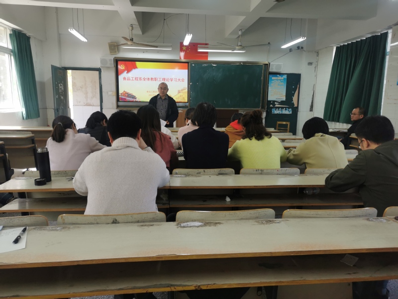 本网讯 4月9日,食品工程系在博学楼201召开全体教职工大会暨政治理论学习会。会议由党总支书记胡风明主持,系主任秦东方,副主任谷燕、夏灿及全体教职工参加会议。