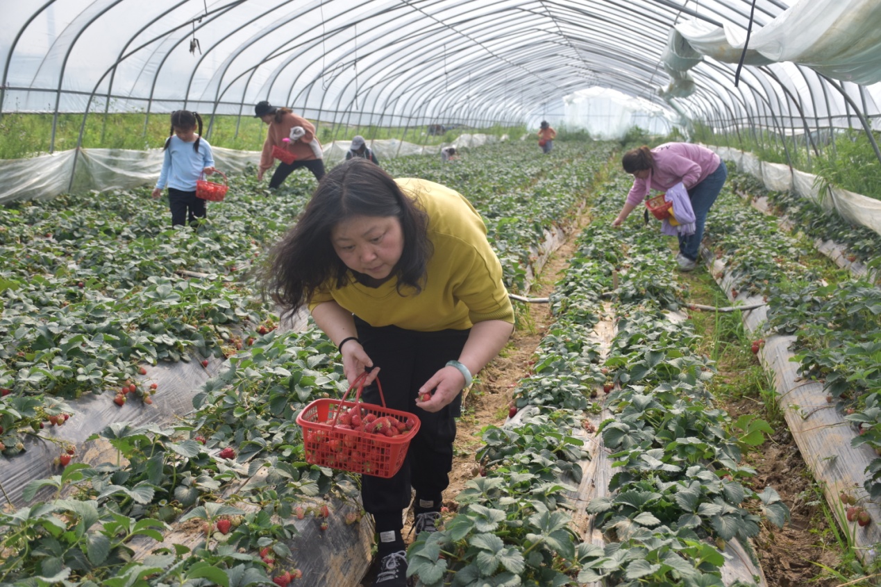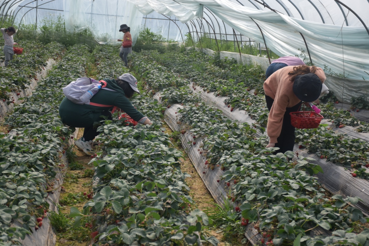 走进草莓基地,映入眼帘的是一个个鲜艳的红果子,大家提着筐子,在大棚中穿梭。