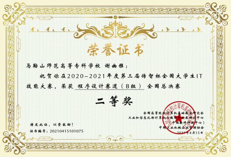 本网讯 在刚刚过去的第三届“传智杯”程序设计类决赛中,我系2019级移动应用与开发专业学生谢幽雅同学,获得全国二等奖。该类比赛来自全国本专科学校886名同学同台竞技,谢幽雅同学名列75名。