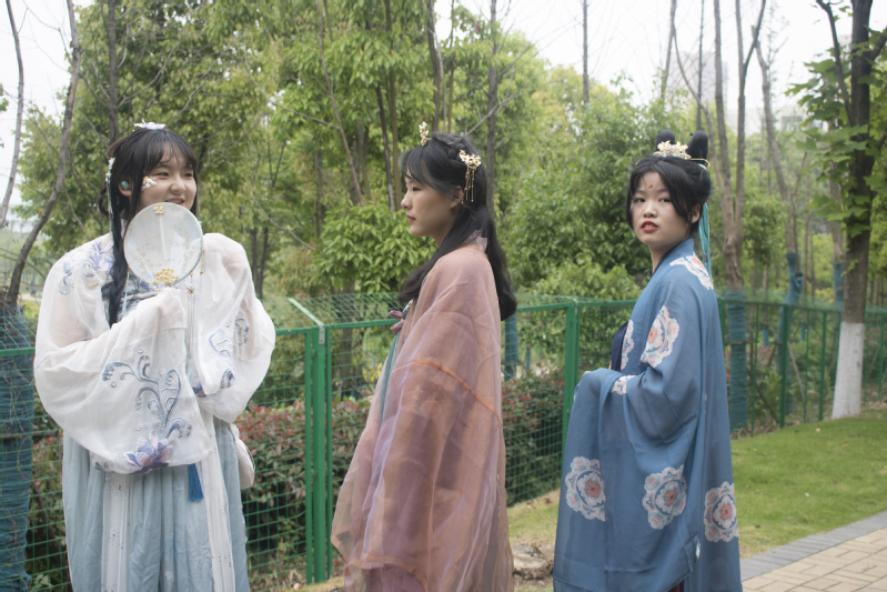丹青社、东洋樱语社等八个社团真可谓是八仙过海,各显神通,精彩纷呈。首先映入我们眼帘的是多才多艺的丹青社,绘画作品色彩丰富、《富贵吉祥》剪纸作品栩栩如生、翰墨飘香的书法刚劲有力,一一展示亮相,吸引不少观众。步入篮球场旁边的小道,迎面就是东洋樱语社的社员们,广袖飘飘的汉服华裳、大气庄重的汉家礼仪,衣裳华美、汉唐古礼,共同构成了一道古香古色的亮丽风景线,赢得了在场同学的阵阵赞许。