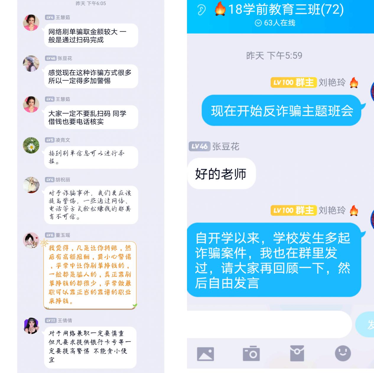 会上伊始,刘艳玲表示,本学期自开学以来,学校发生了多起诈骗案件,之前也在群里及时与大家分享过,希望同学们提高警惕、谨防受骗。同时,她建议同学们在回顾案例的基础上,通过自由发言交流,畅谈反诈技巧,以供大家共同学习。班会上,2018级学前教育3班王慧茹表示“网络刷单骗取金额较大,一般是通过扫码完成,大家一定不要乱扫码 同学借钱也要电话核实”;凌竞文认为“接到刷单信息可以进行举报”;张豆花表示:“感觉现在这种诈骗方式很多 所以一定得多加警惕”……大家纷纷发表自己的意见,表示“对于诈骗事件,应该提高警惕,一些通过网络、电话等方式轻松赚钱的都不可信”“网络兼职一定要慎重,不能贪小便宜”“不会有天上掉馅饼的好事”。