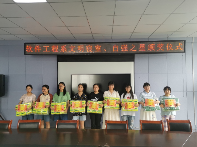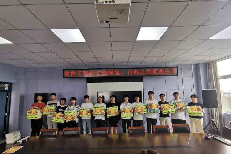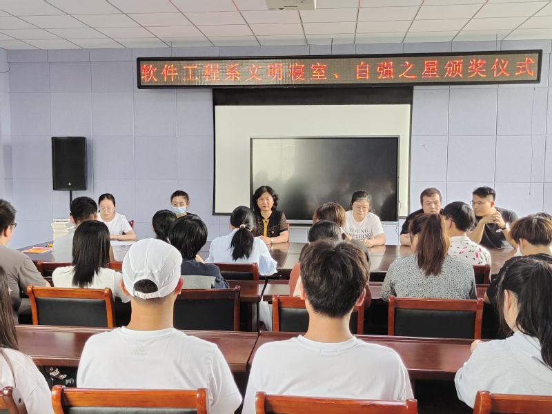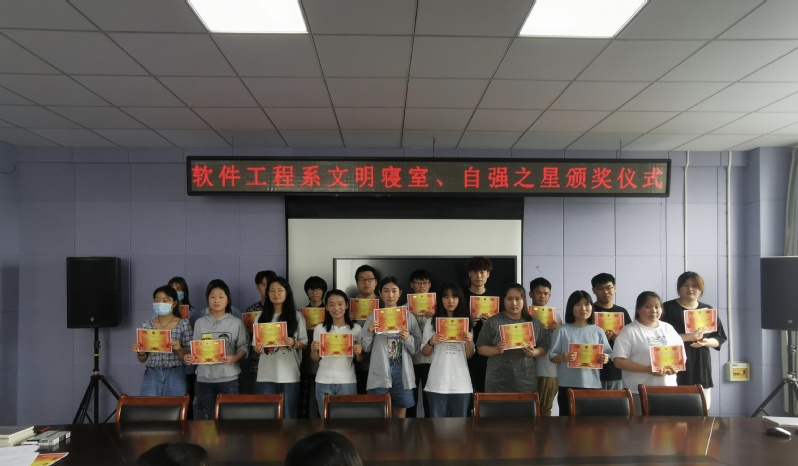本网讯 6月17日中午,软件工程系举办了第一届“自强之星”和“文明寝室”颁奖活动,系党总支书记王莉娟、全体辅导员以及获奖学生代表参加了本次活动。活动由刘雨茜老师主持。