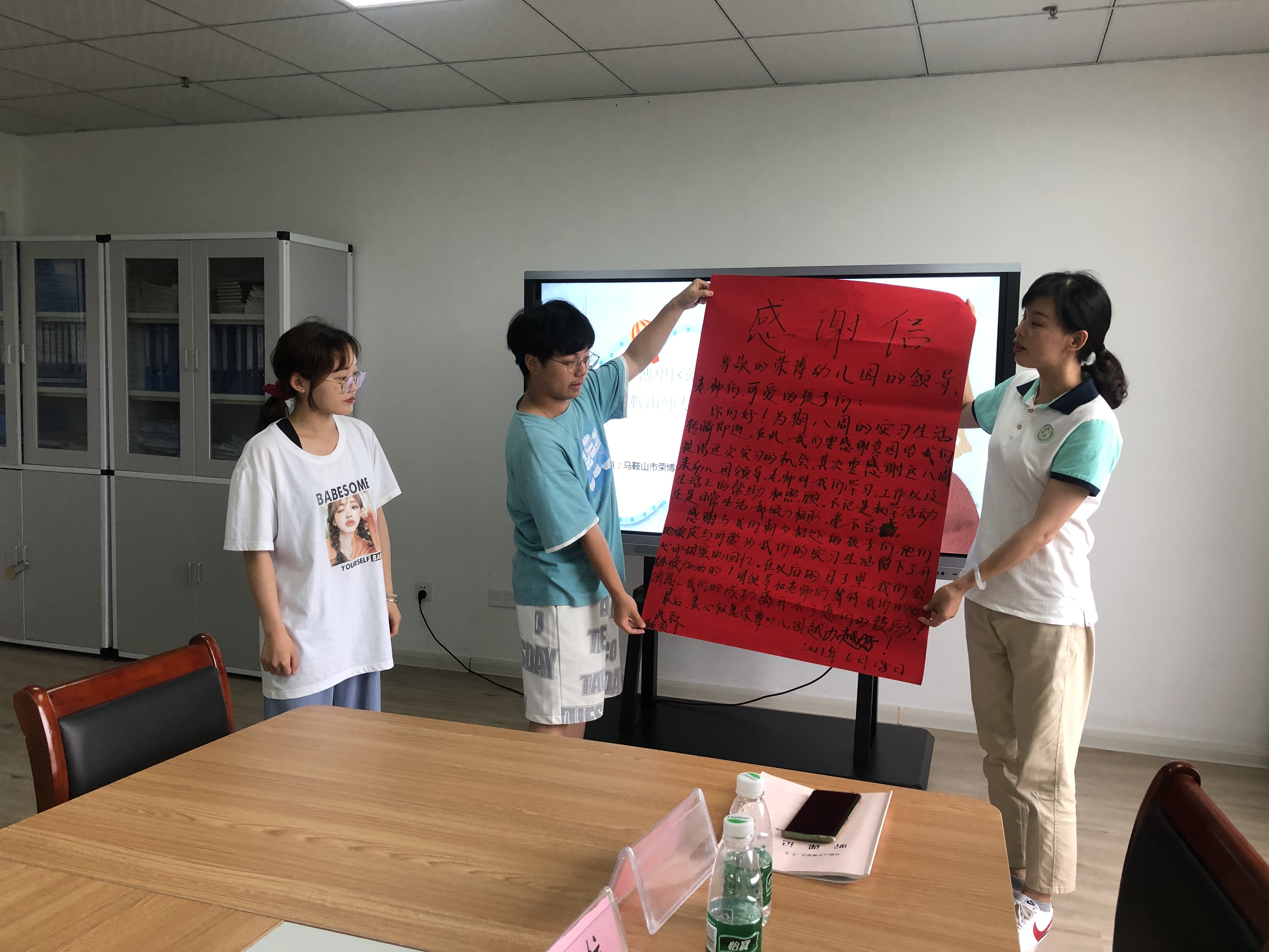 最后,博望区学前教育实习生欢送会在荣博幼儿园会议室举行。首先,实习生们谈了他们的实习感受。他们纷纷表示,博望区三所幼儿园对他们给予了无微不至的关怀,各位指导教师在实习中更是倾囊相授,最令其难忘的是,周末时,不止一次,他们到老师家吃饭,有的同学还流下了感激和不舍的泪水。接着,幼儿园园长们也一致表示,这次的实习生基本素质高,能很快上手,实习效果好,特别是有一次幼儿园停水,实习生提前打好十几桶水备用,不吃辛劳。吴德琴和田雯雯也都表示,博望区教育局对这次实习的重视程度令人感动,幼儿园的相当支持,8名实习生不虚此行,将来,师专可以考虑把更多的实习生送来实习。最后,陶家成表示,感谢师专送来的实习生,为博望的幼儿教育注入了活力,希望这些学生把博望对师专学生的渴求带回去,在顶岗实习时欢迎他们带着自己的同学再次回到博望。