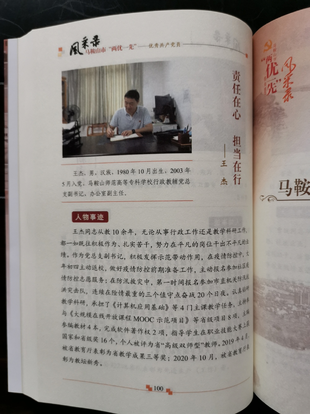 王杰不断强化宗旨意识和奉献意识,强化服务学校发展大局意识,服务学校声誉提升意识,努力练就工作硬作风。自2016年3月以来,他先后担任马鞍山师专总务财务处副处长、财务处副处长(主持工作)、学校办公室副主任(主持工作),为了更好的做好工作,他不断补充新的知识,从土木工程到预算造价,从食堂的原材料到饭菜售卖中间的各个环节;从财务管理到内控建设,从经费核算到简化报销流程;从当好参谋助手到聚焦管理育人、服务育人,从办文办会办事到提供决策服务,每到一个工作岗位,每接受一项全新任务,他都事无巨细,悉心学习,怀揣“一切为了师生、为了师生的一切”,秉承细心,精心,热心,耐心,实现总务后勤、财务、办公室工作“科学化、规范化、制度化”,充分发挥对内管理、对外联络、统筹协调、综合服务的作用。