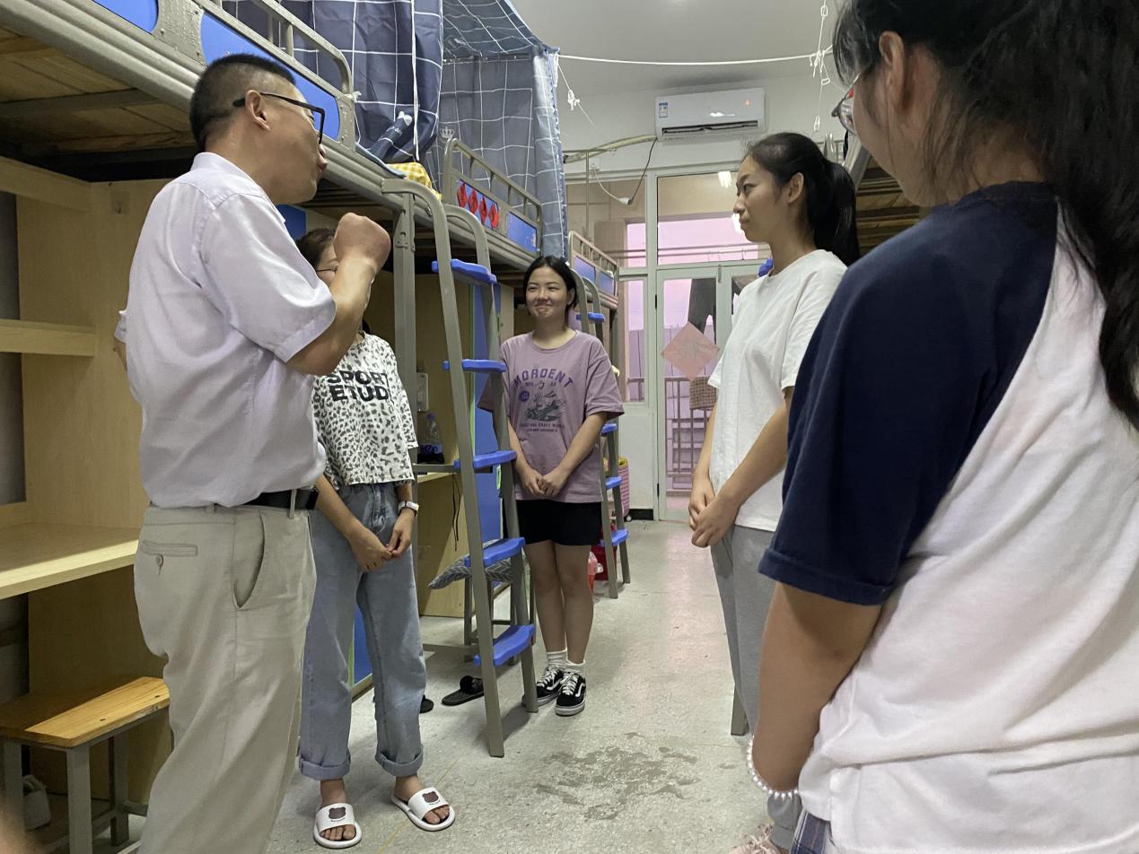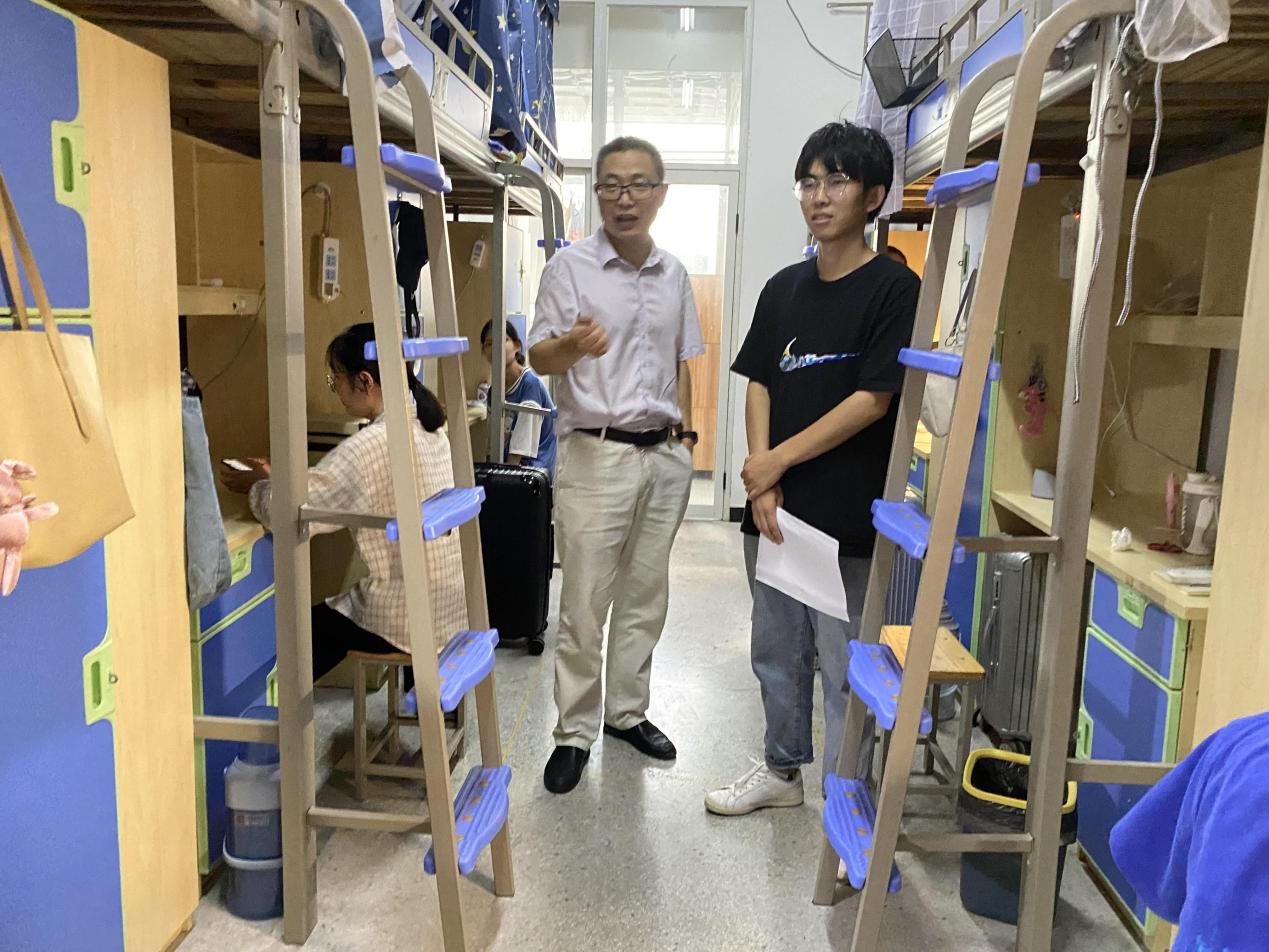走访中,每进一个宿舍之前,冯金燕都会先敲门询问,可适合男性老师进入走访,在得到允可的情况下,老师们方才进入。王结贵仔细查看了宿舍的生活设施和卫生情况,并亲切地询问新同学“是从哪个学校考进来的”“对新学校的生活还习惯吗”……他建议同学们在宿舍要养成良好的生活习惯,早日树立新目标,提前做好未来筹划。交流中,王结贵还向同学们介绍了校本部周边环境,“学校邻近长江、采石矶风景区和万达生活区,交通、生活设施便利。”他希望同学之间能够团结友善、互相帮助、互相促进,有问题及时向辅导员反馈。汪文君就控制空调温度、开班会时间、领取书本时间、第一天上课的课前安排等做了提醒。