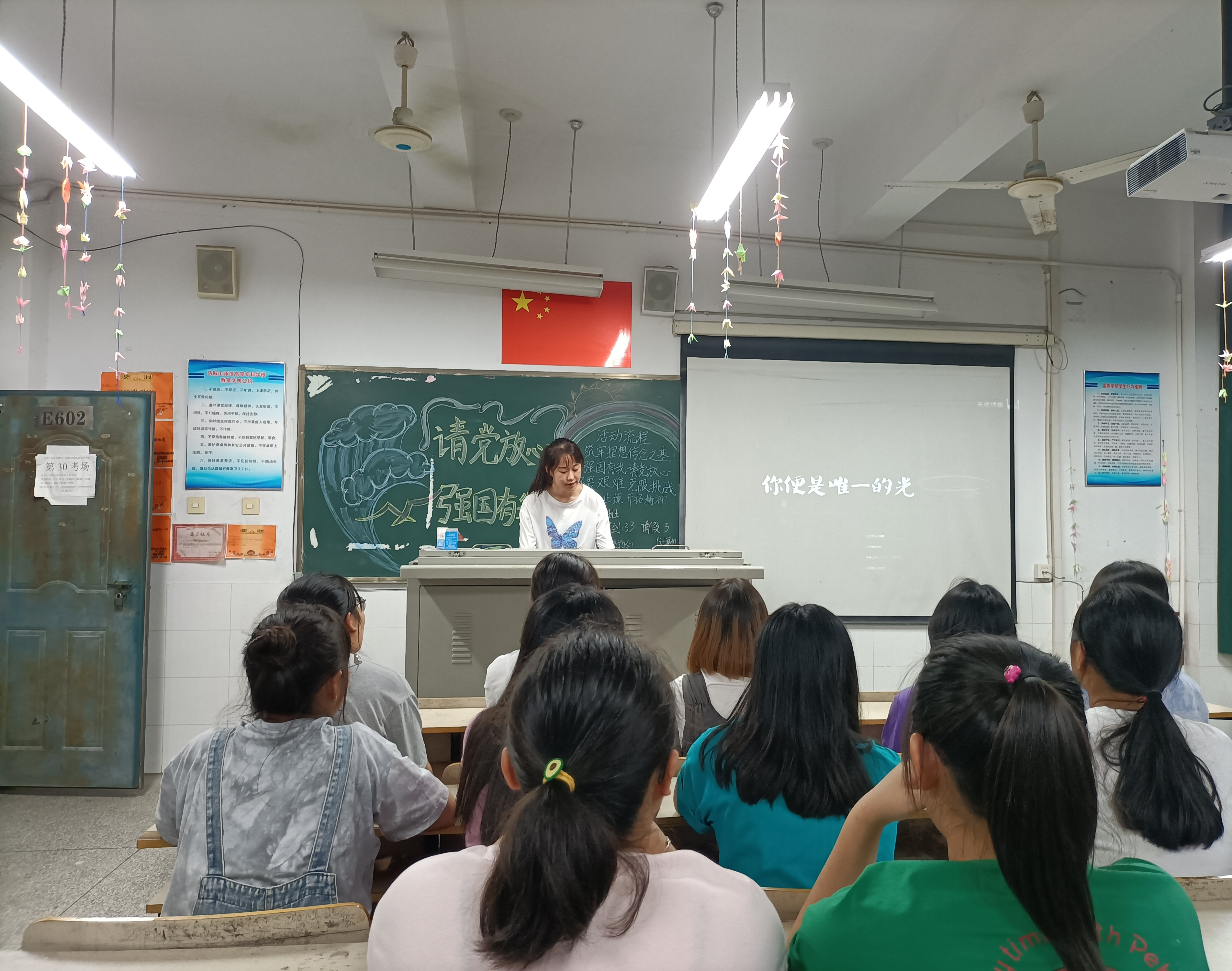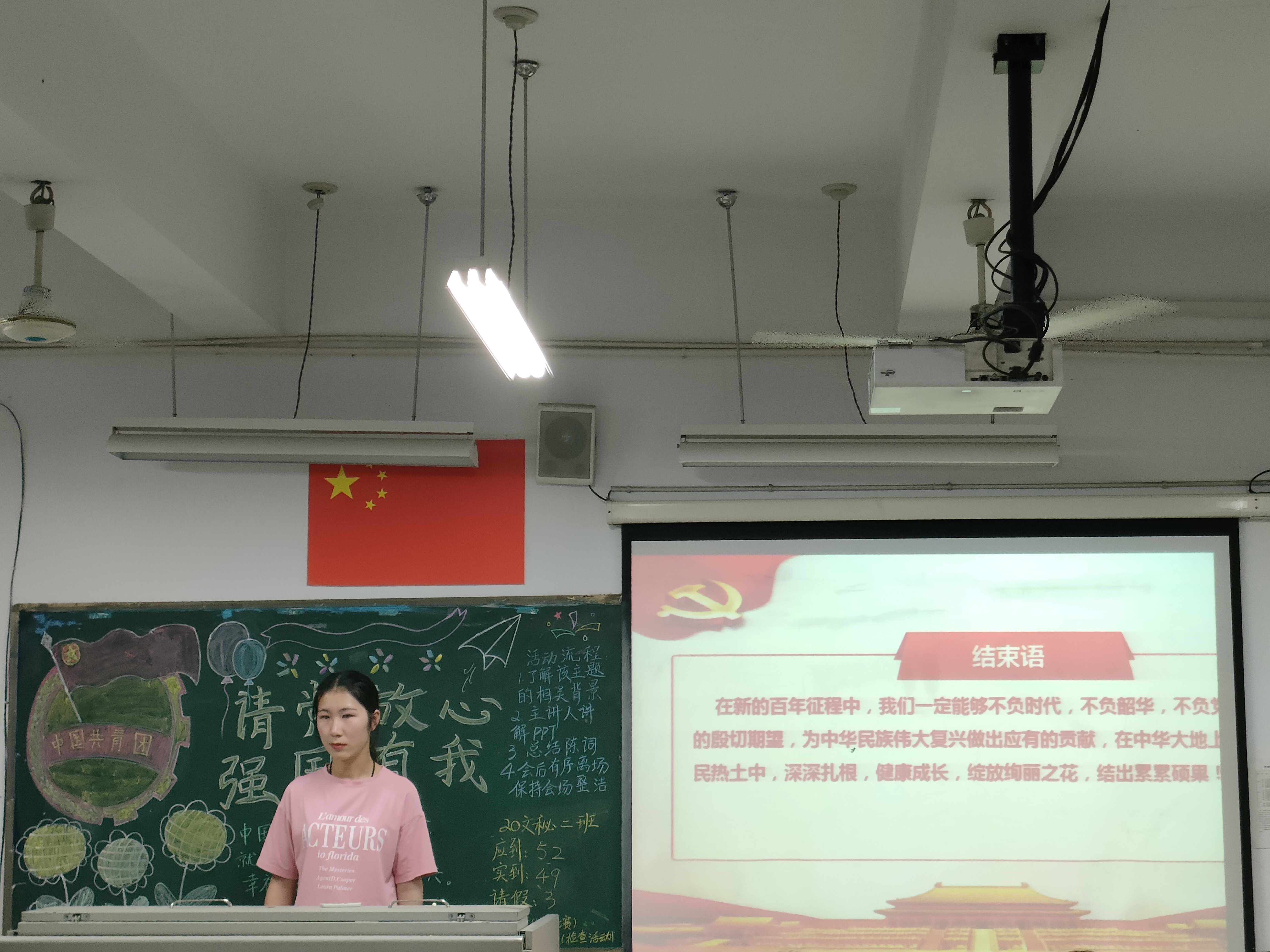 2020级文秘(2)班学委朱玉婷在此次主题团日活动中带领班级同学回顾了百年征程,她向全班同学强调“这100年的伟大成就,是先辈们用奉献牺牲换来的;作为新时代青年的我们需不忘初心接续奋斗。”