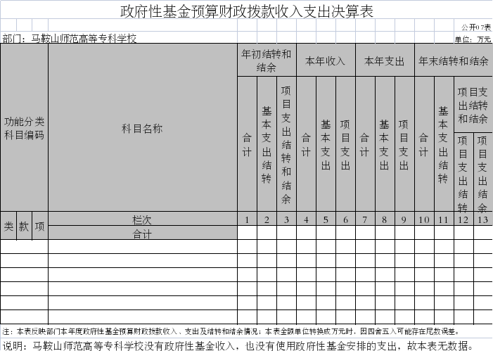 2020年度马鞍山师范高等专科学校没有政府性基金收入,也没有使用政府性基金安排的支出。