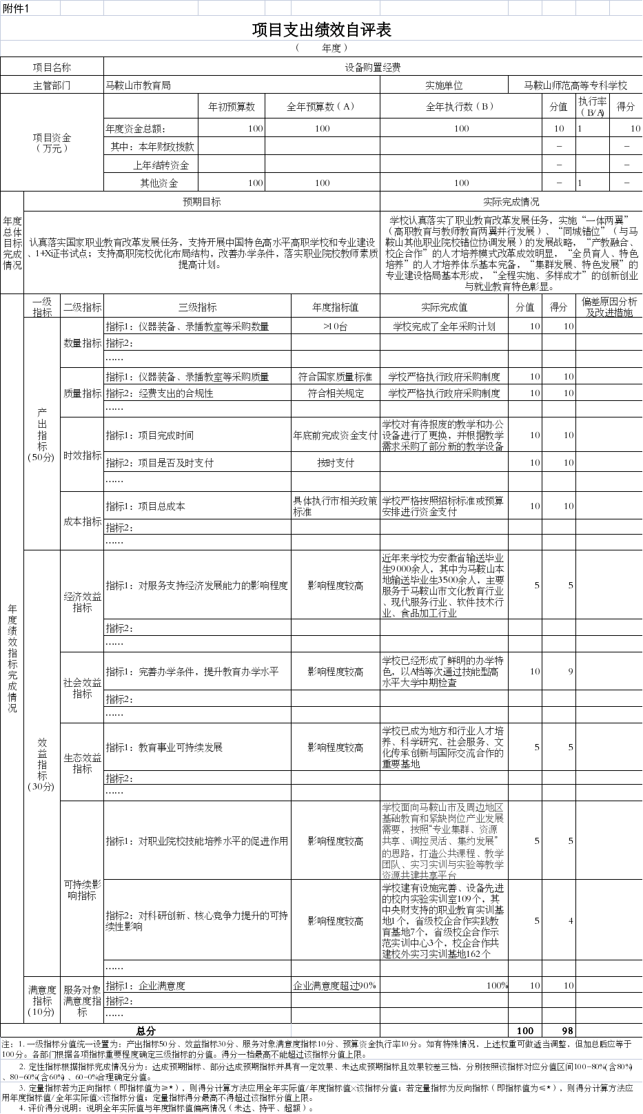 设备购置经费项目绩效自评综述:根据年初设定的绩效目标,项目绩效自评得分为98分。全年预算数为100万元,执行数为100万元,完成预算的100%。项目绩效目标完成情况:一是仪器装备、教学设备等采购数量超过10台,完成了当年度的采购计划;二是资金支付进度达100%,学校对达到报废年限的教学和办公设备进行了更换;三是学校已成为地方和行业人才培养、科学研究、社会服务、文化传承创新与国际交流合作的重要基地。发现的主要问题及原因:资产管理的内部控制环节较为薄弱。下一步改进措施:一是加强资产管理,建立授权批准制度,各项经济业务必须经过规定程序的授权批准,明确相关部门人员的责任、权利与义务,定期对各项财产物资进行盘点,并将盘点结果与财务进行核对,出现不一致时应分析原因、查明责任、完善管理制度;二是构建科学的绩效评价体系,提高预算管理水平。