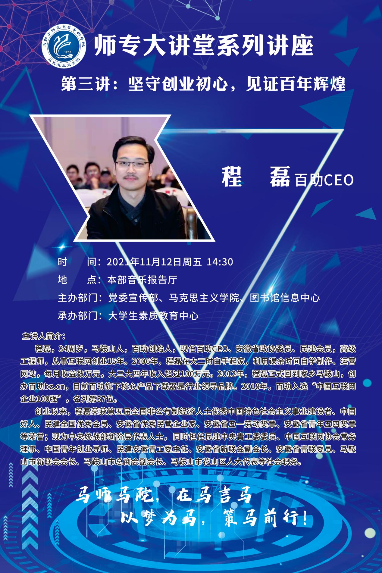【师专大讲堂系列讲座海报】第三讲:坚守创业初心,见证百年辉煌