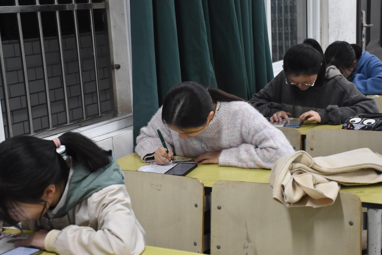 晚上7:00,活动准时开始。为保障比赛的公平性,每个教室配有三名工作人员,负责监督参赛选手比赛情况。比赛开始后,各参赛选手按比赛要求,纷纷拿出自备的纸笔进行练习,赛场内紧张有序,每个人都在聚精会神地书写着,只留下沙沙的笔尖划过纸张的声音。大家都尽力在作品中表现出自己的最高水平,形成了一道道亮丽的风景线,一张张稿纸上呈现出的是同学们扎实的书写功底。