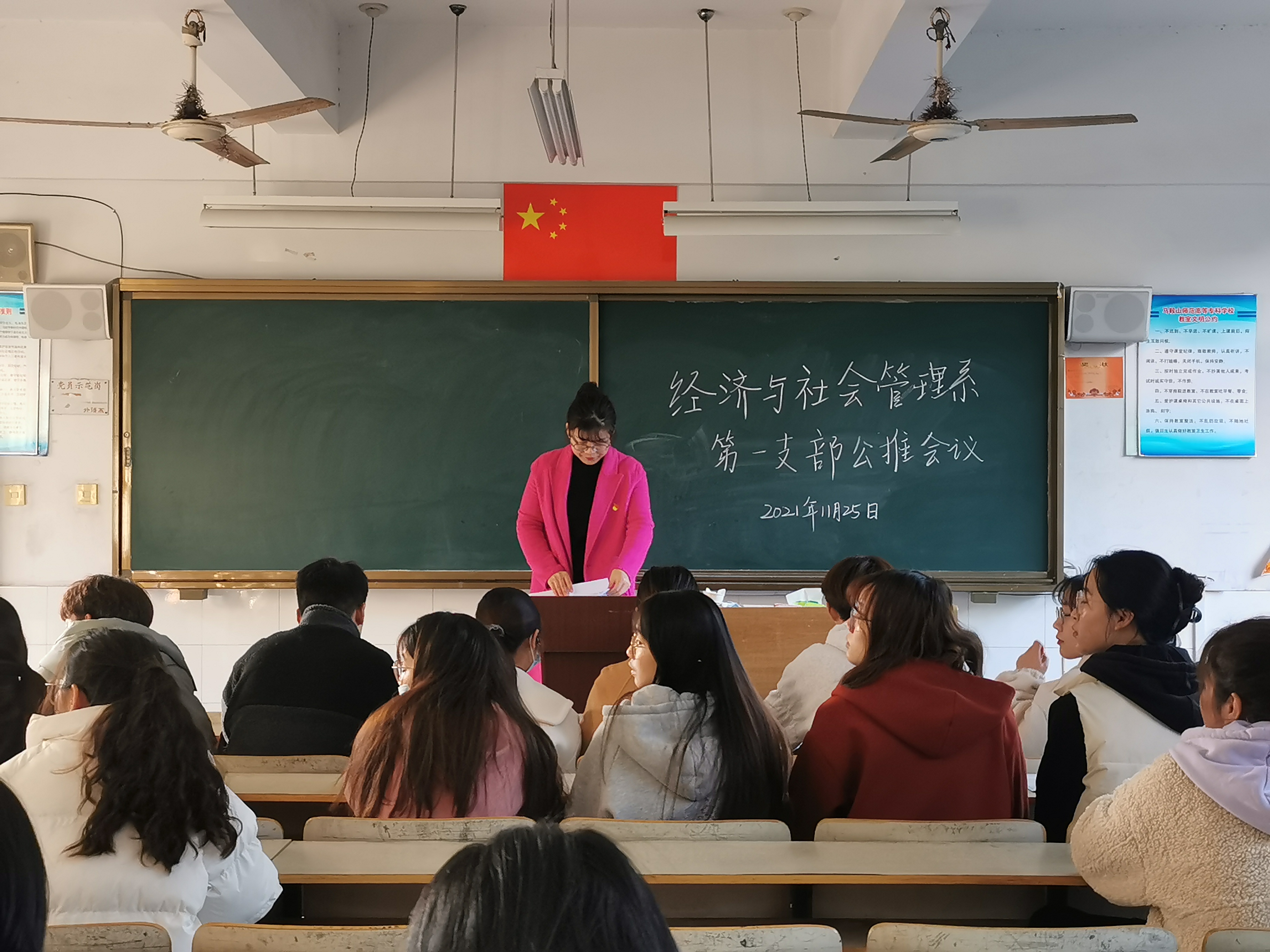 本网讯 11月25日下午,经济与社会管理系第一党支部在D205教室组织召开了2021年下半年公推会议。会议由支部书记曹本霞老师主持,支部党员,辅导员但德阳、陈月婷和群众代表参加了本次会议。