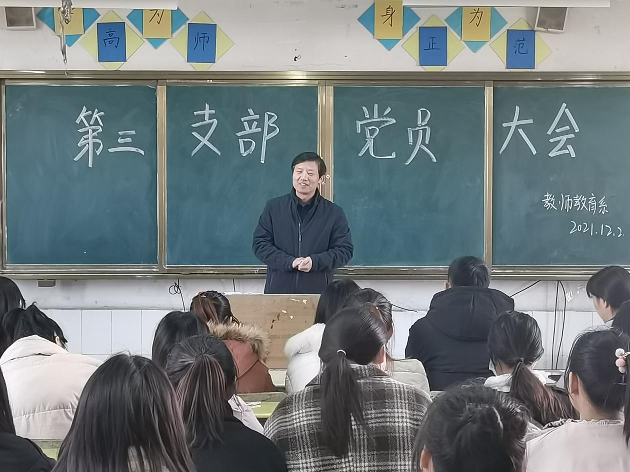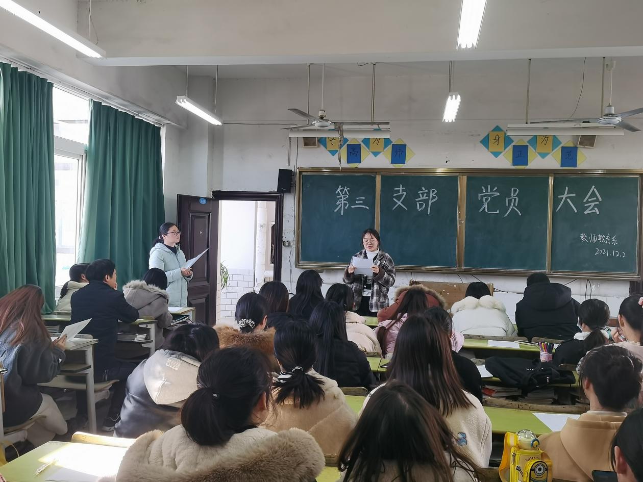 本网讯 12月2日中午,教师教育系党总支第三党支部在A401教室召开支部党员大会,主题是讨论6位预备党员转正问题。大会由该支部书记戴明丽主持,校党委委员、副校长、宣传部部长李胜以普通党员身份参加会议,第三党支部师生党员一同参加。
