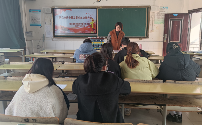 本网讯 12月7日中午,教师教育系(基础部)第二党支部在修德楼402组织召开了2021年下半年群众座谈会暨公推会议。会议由袁媛主持,全体党员及部分学生代表参加了此次会议。