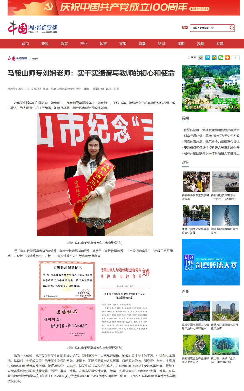【中国网】马鞍山师专刘娴老师:实干实绩谱写教师的初心和使命