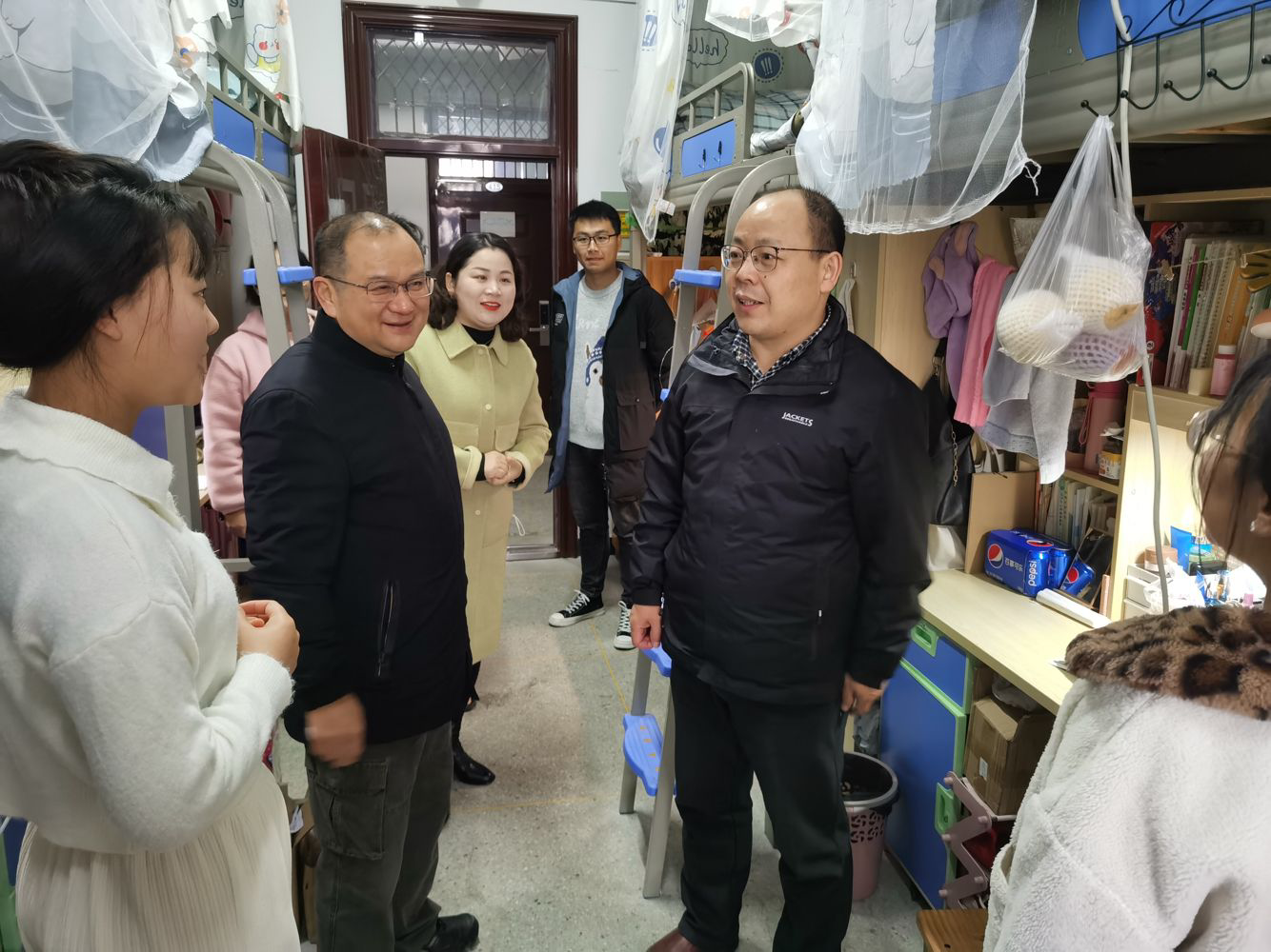 本网讯 为全面了解经济与社会管理系学子在校住宿环境,切实解决学生在生活和学习上可能遇到的问题,全力消除宿舍安全隐患,创造良好的住宿环境,12月15日,由校党委委员、副校长周志亮带队,经管系党总支书记胡风明及全体辅导员、班主任组成走访小组,积极开展走访慰问活动。