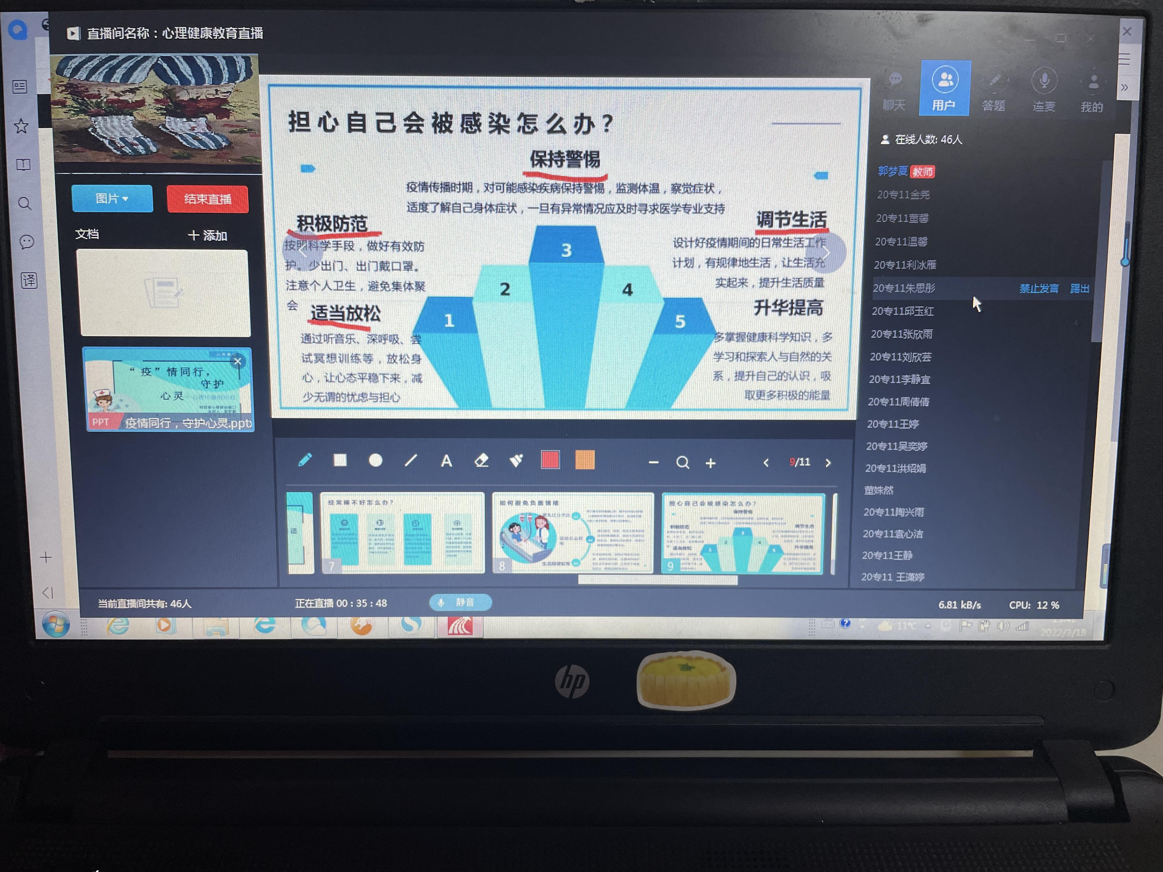 四是开展心理危机干预,保证应急干预及时。学校分类制定了心理危机干预方案,开展疫情心理知识科普工作,筑牢心理“防火墙”。开展线上疫情心理危机干预系列培训,培训内容包括疫情心理应激系列讲座、常用心理调适方法等。通过培训,加强心理危机应对能力,帮助师生了解疫情心理危机发展变化的全过程,掌握心理干预的核心技术,把握开展心理干预的最佳时机,提高应对疫情心理问题的援助能力。