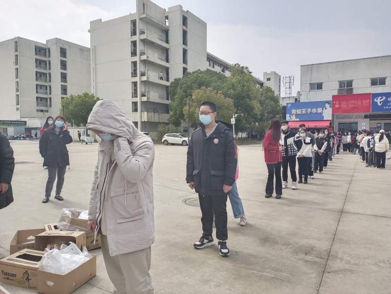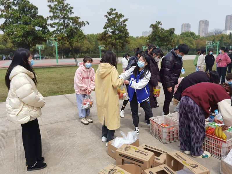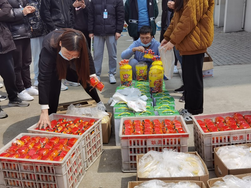 辅导员们和学生会成员及各班班长提前把“暖心袋”搬到学生宿舍楼下,随后各寝室长严格按照疫情防控要求,佩戴口罩有序排队,自觉间隔一米线,系学生会成员按照各寝室人数发放“暖心袋”。