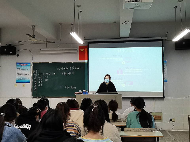 由于疫情的原因,本次活动主要以线上直播的形式开展,部分班级采用线下班会的方式进行,主题围绕与校园生活密切相关的衣、食、住等行为。班会由各班生活委员主持,首先,生活委员利用PPT向同学们展示校园中发生的种种不文明行为:在教室吃早餐、衣着过于随意、使用违规电器、不注意寝室卫生等等,其次,分析这些行为给他人和校园带来的不良影响,最后,就这些问题,有针对性的提出改进的方法,并对同学们提出了具体的要求。