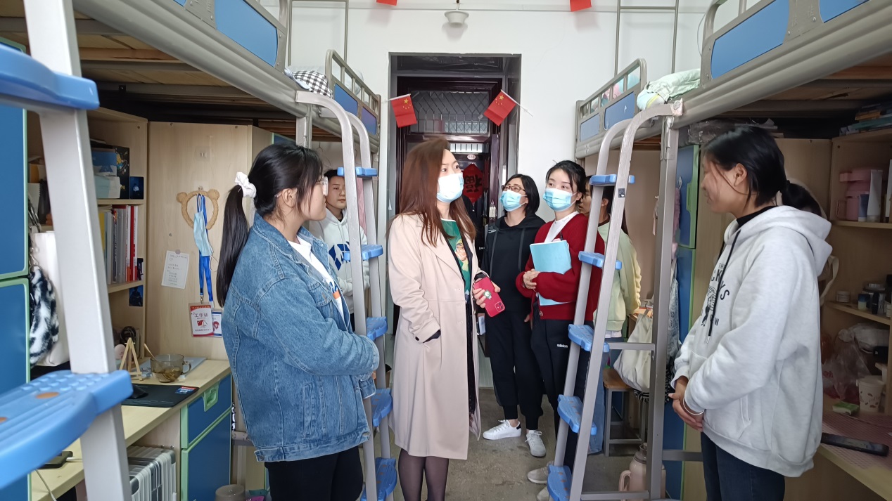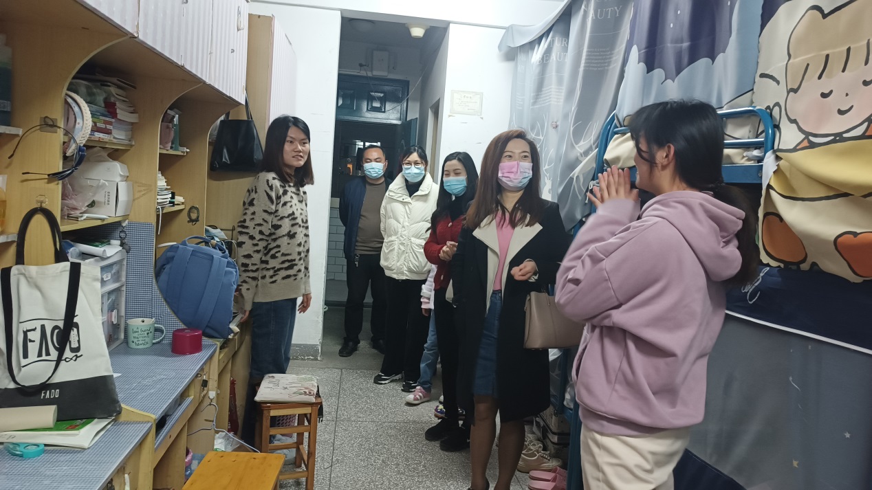 本网讯 为进一步了解疫情防控期间同学们的思想及生活学习状况,传递关爱,4月4日和4月5日,旅游与外语系党总支书记徐基宏、组织员张军、团总支书记陈盼盼和全体辅导员深入宿舍走访慰问。