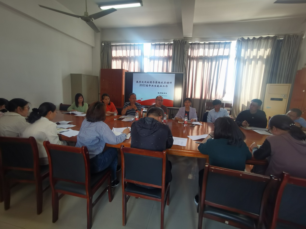 本网讯 为进一步推进落实2022届毕业生就业工作,校党委副书记、校长刘淑凤一行于5月5日下午来到教师教育系(基础部)开展调研工作。校党委委员、副校长周志亮,校党委委员、副校长李胜等随行调研。校党委委员、系主任栗亮,党总支书记王结贵,学生处处长汪志彬,学生处副处长晋愈飞,系副主任王红艳、陈小凤等参加调研。