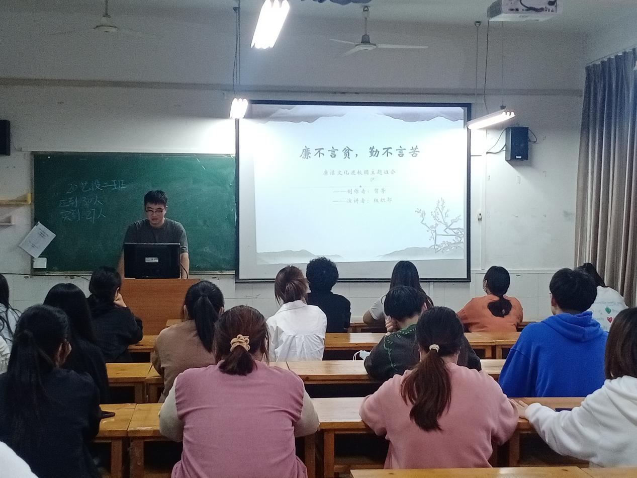 本网讯 清廉驻校园,清风润心田,为加强艺术设计系学生们的思想道德建设,推动廉洁文化进校园,5月12日,艺术设计系学生会组织部于丹青楼安排各班级开展了 “廉不言贫,勤不言苦”主题班会活动。